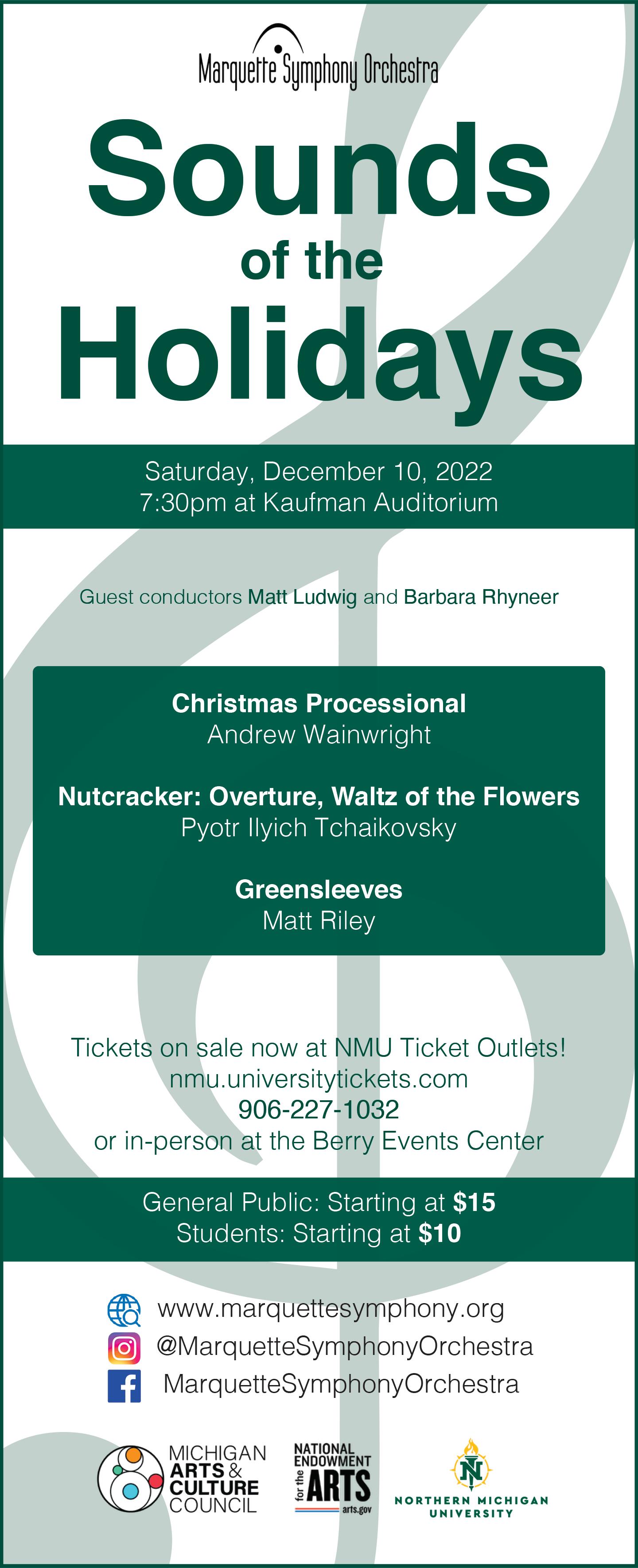 • Marquette Choral Society Holiday Concerts. The group will perform A Ceremony of Carols by Benjamin Brit ten and Carols and Lullabies: Christ mas in the Southwest by Conrad Susa. This activity is supported by the Michi gan Arts and Culture Council, adminis tered by Upper Peninsula Arts and Cul ture Alliance. Seniors, students and children, $5; general public, $10. 3 p.m. Kaufman Auditorium, 611 N. Front St. nmu.universitytickets.com