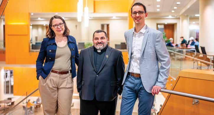 Jill Guttormson, dean of the Marquette College of Nursing, Michael Simone, S.J., pastor of the Church of the Gesu, and John McKinnon, director of the Haggerty Museum of Art, gather in Eckstein Hall.