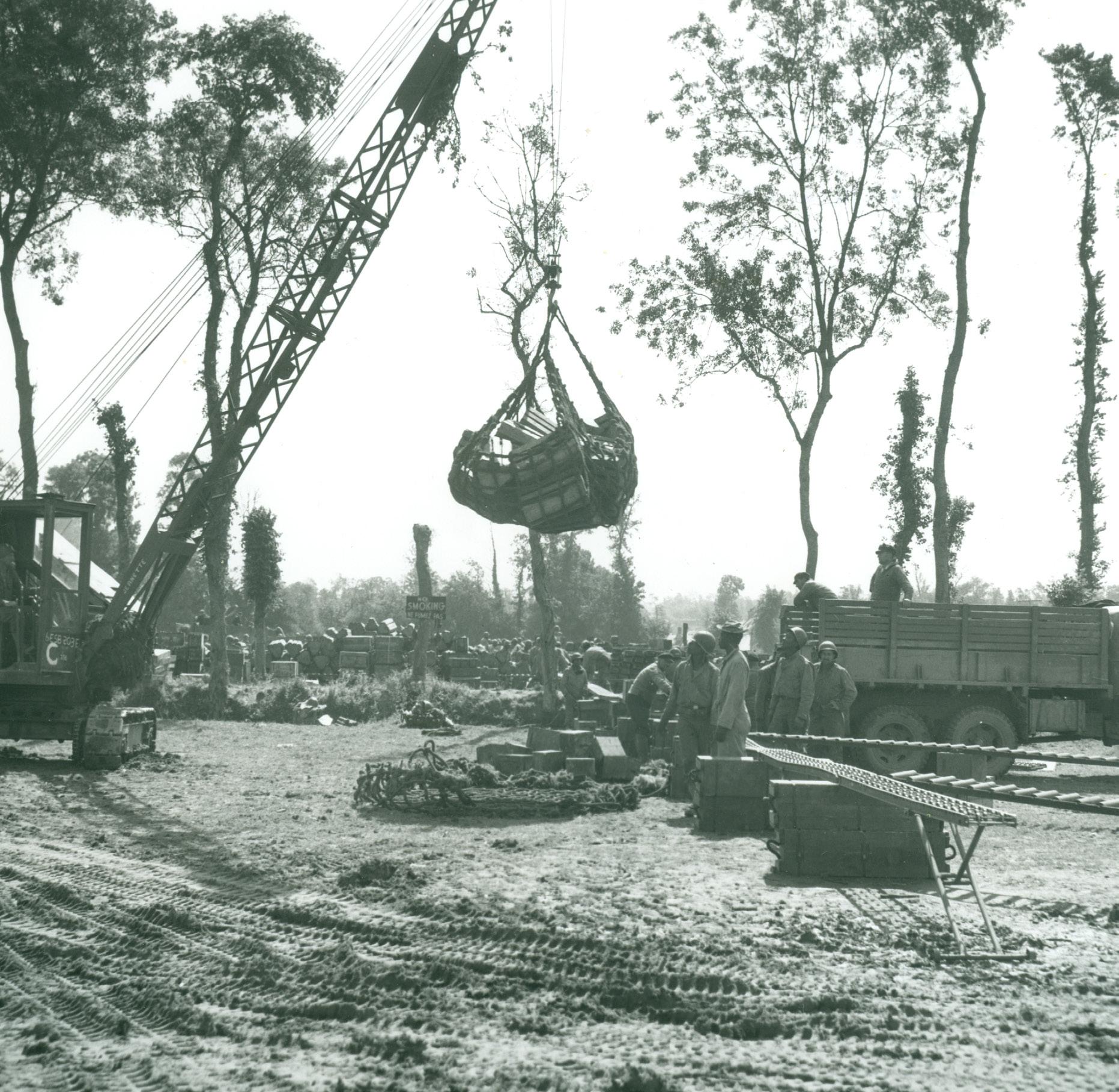 Crane at a supply dump in Normandy removing a sling load of supplies from a 2.5-ton truck. GCMF photo.