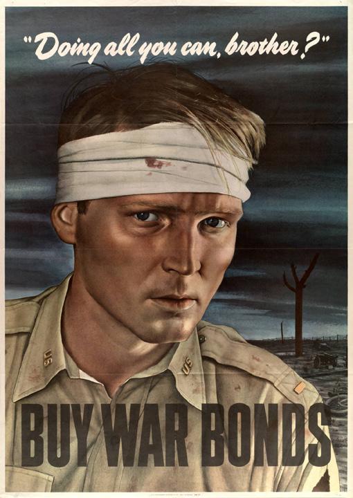 This Jes Wilhelm Schlaikjer poster depicts a medic tending to a wounded soldier. Identified by the red cross on their armbands and helmets, combat medics played a vital role during World War II. When a soldier was wounded or injured, combat medics would provide aid to stabilize the soldier before transporting him to a field hospital for further treatment. One of the most famous combat medics of the war was Corporal Desmond Doss, who served in the Pacific. Doss, a native of Lynchburg, VA, was a Seventh Day Adventist who refused to use a weapon but still wanted to serve his country. On Okinawa in 1945, his unit was tasked with taking Hacksaw Ridge, a high plateau that the Japanese were heavily defending. After the failed attack left many wounded Americans stranded on the cliff, Doss single handily rescued seventy-five American soldiers over a twelve-hour period. For his bravery, Doss was awarded the Medal of Honor.