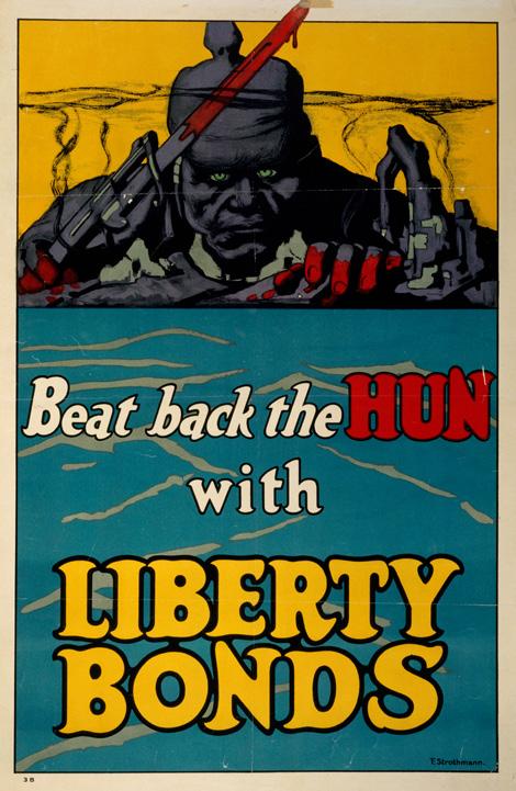 Frederick Strothmann was a talented illustrator with an extensive career prior to World War I. He illustrated three of Mark Twain’s works and illustrated for Harper’s Magazine, The Saturday Evening Post, Good Housekeeping, Colliers’, and Life magazine. He designed this poster as part of a contest for the Fourth Liberty Loan Drive during World War I. Much like its Second World War counterpart, Liberty Loan Drives were the sale of bonds to the general public in order to finance the war effort in World War I. Americans who purchased bonds could cash them in at a higher price several years later. Strothmann submitted this design as part of a nation-wide contest and was one of nine submissions selected to be mass produced as posters. Strothmann played upon the fears of the American people by depicting a German soldier as a monster, with bloody hands crushing the ruins of city and blood dripping from his bayonet. The term “Hun” was a slang term used to refer to German soldiers and was derived from a speech given by Kaiser Wilhelm