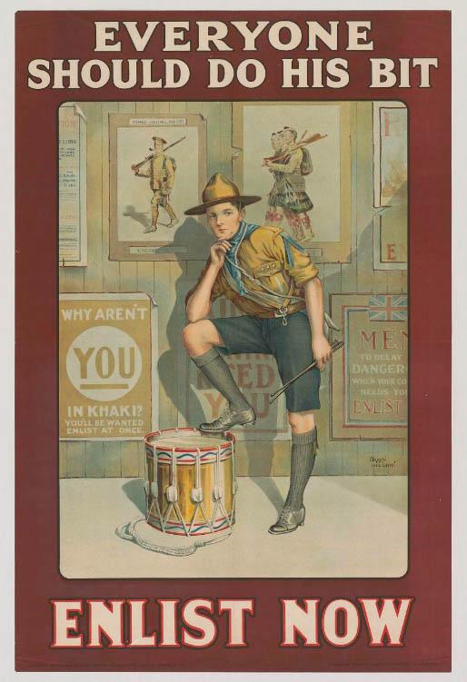 During the First World War, nearly every part of British society mobilized for the war effort. This poster shows the various roles open to British citizens, both men and women. The foreground depicts a male factory worker with a raised hammer. The center shows a female munitions factory worker assembling cartridges and a nurse. In the background, a Boy Scout hands a package to soldier, which could contain anything from ammunition, food, or a care package from home. Behind them, a Royal Navy sailor positions an artillery piece. Off to the right side of the poster, a well-dressed man stands to the side watching scene. The phrase “Are You In This?” was aimed at the people who were not directly involved in the war effort, like the well-dressed man, and galvanized them to do whatever they could. The inclusion of a Boy Scout is notable since the creator of the poster, Lt. Gen. Sir Robert S.S. Baden-Powell, founded the Boy Scouts in the United Kingdom in 1908.