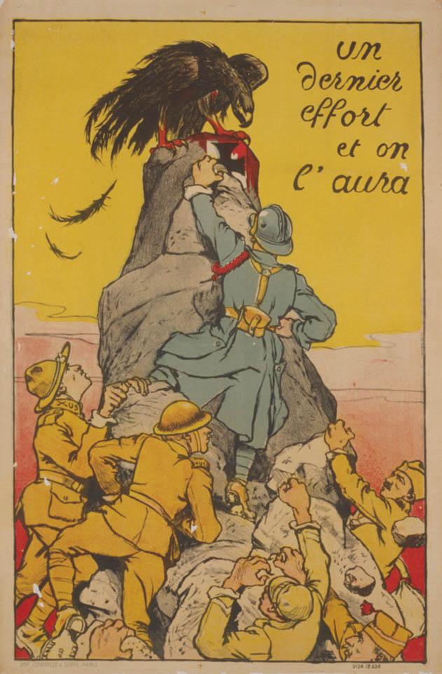 Published in 1917, this French poster shows that the First World War may be over soon. Various soldiers from Allied nations, including France, the United Kingdom, and the United States are seen climbing a large rock with an eagle pearched atop. The Iron Cross, a German military decoration, is blood stained and the eagle, symbolizing Imperial Germany, looks haggered as its tail feathers are falling out. The reason for this sudden optimism in the war’s end was a result of the United State’s entrance into the war on April 6, 1917. After remaining neutral for almost three years, the entrance of the United States meant that the Allied powers would benefit from the United States’ industrial capacity and its massive population for more troops.