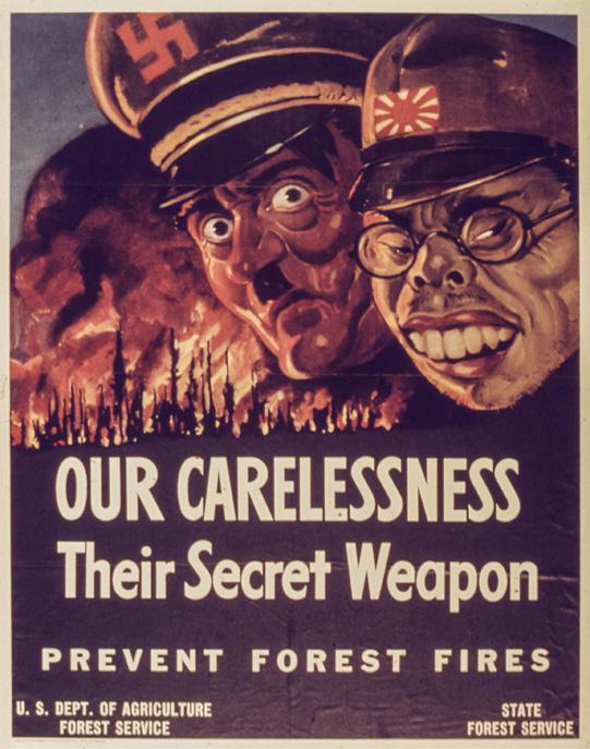 During the Second World War, anything that hurt the United States economically, militarily, or politically was viewed as win for the Axis powers. This poster is encouraging Americans to be careful with fire to prevent forest fires from breaking out and spreading. Wood was an essential war material and was used in a variety of things including airframes for aircraft and stocks for rifles. The depiction of a Japanese soldier highlights the anti-Japanese sentiment of many Americans during the war. Many propaganda posters depicted Japanese soldiers with small, beady eyes, oversized buck teeth, and large ears. Others depicted the Japanese as inhuman monsters. Often, Japanese Emperor Hirohito or Prime Minister Hideki Tojo were the basis of Japanese depictions in these posters. This poster shows the common Japanese stereotypes: big ears, beady eyes, and buck teeth. Given the shape of the glasses, it is possible that this caricature was based on Hirohito.