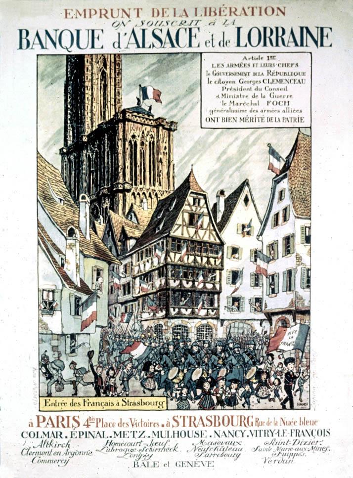 In the aftermath of the French Revolution of 1848, which saw the formation of the Second French Republic, the Comptoir National d’Escompte de Paris was created to help stabilize the new republic’s finances. It became Banque Nationale de Paris in 1966 and BNP Paribas in 2000. During the First World War, the Comptoir National d’Escompte de Paris participated in various loan drives to help finance the war. These functioned in a manner like war bond drives in the United States during both world wars. This poster was designed by Auguste Leroux for the Fourth War Loan, known as the Liberation Loan. It lasted from October 20 to November 24, 1918 and the poster highlights one of the major French goals of the war, the recovery of Alsace and Lorraine. These territories were located on the French-German border and had been traditionally French territories since 1648. However, as a result of the French defeat during the Franco-Prussian War (1870-1871), they had been taken by Germany. Still feeling the humiliation of their loss a generation earlier,