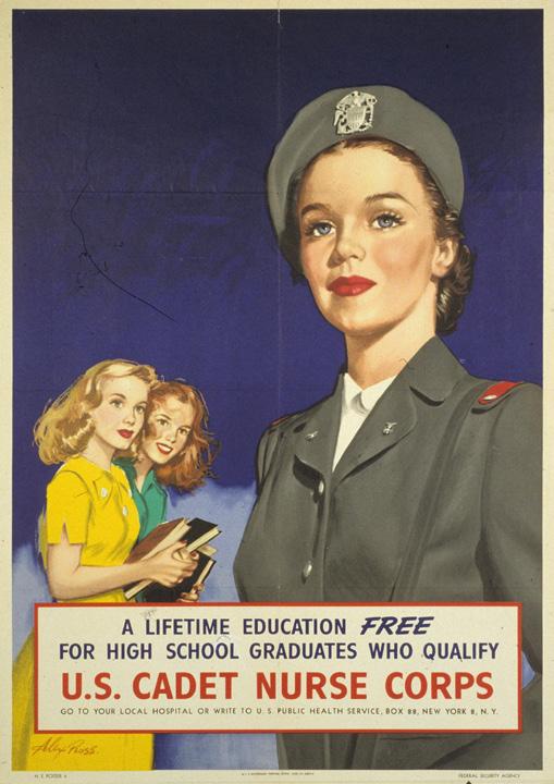 As their mothers and grandmothers had during the First World War, women in the Second World War contributed to the war effort in a variety of ways, with serving as nurses being one of the most prominent roles. After 1942, there was a nursing shortage, and in 1943, Congresswoman Frances P. Bolton of Ohio created the U.S. Cadet Nurse Corps through legislation to help alleviate this shortage. The program was open to women who were between 17 and 35 years old who had graduated from high school in good academic standing. Uniquely, the Cadet Nurses Corps was not a segregated service and forty Native American women from twenty-five tribes, 3,000 African American women, and numerous Japanese American women enrolled. The foreground of the poster shows a member of the Cadet Nurse Corps in her uniform with two high school aged girls looking at her with admiration.