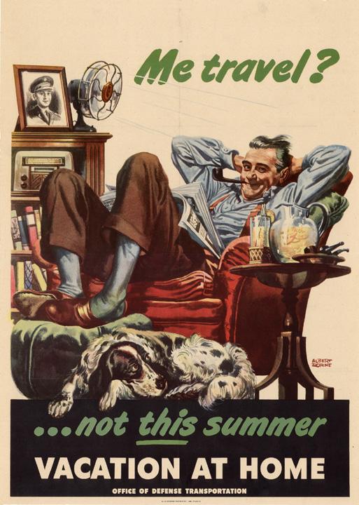 This post was produced in 1945 and despite the end of the Second World War being in sight, the U.S. Government was still encouraging rationing of gas and rubber tires. In this poster, a man is recreating what it would be like to be on vacation, probably at a beach, in his home. He has a fan blowing on him to mimic the wind and a glass and pitcher of lemonade on the side table. This, combined with his laid paid posture is meant to imply that American’s can enjoy the experience of being on vacation while staying at home and not using gas or putting wear on the tires of their vehicle.