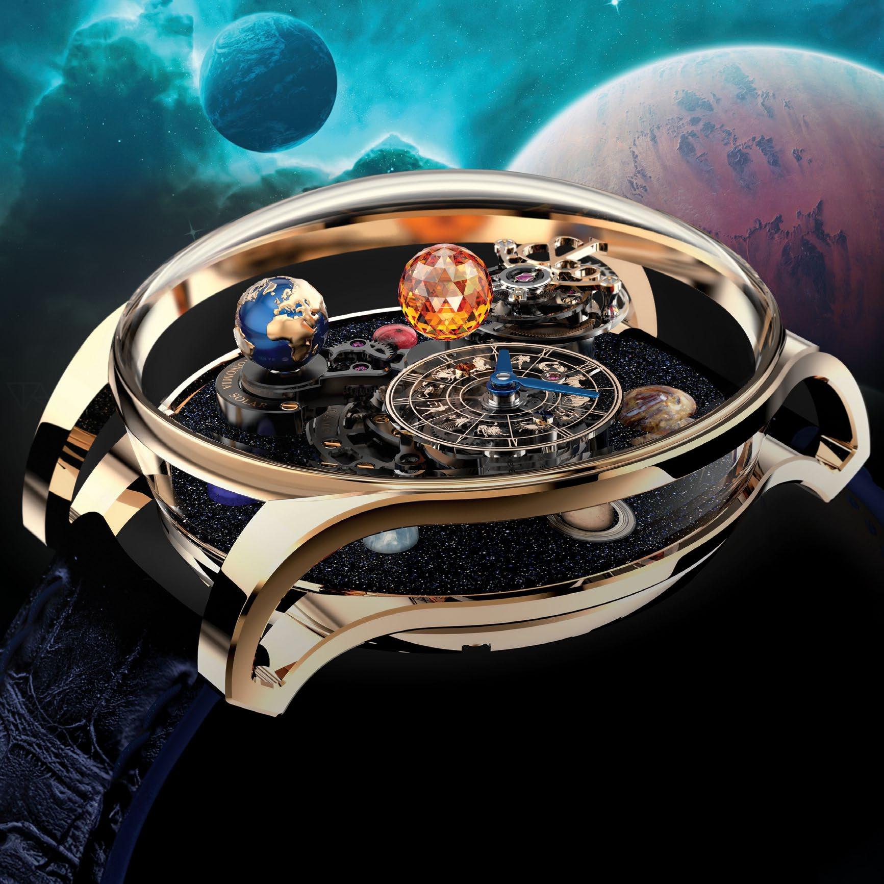 BaguetteAt the heart of the Astronomia Solar Baguette watch is a meticulously handcrafted miniature solar system, suspended within a sapphire crystal case. The centerpiece of the watch is a threedimensional representation of the Earth, adorned with baguette-cut diamonds to symbolize the planet’s natural beauty. Surrounding the Earth are intricately detailed miniature planets, each crafted from precious materials such as sapphire, ruby, and emerald. These planets, including Mercury, Venus, Mars, and Jupiter, are meticulously positioned to mimic their real-life orbits around the sun.