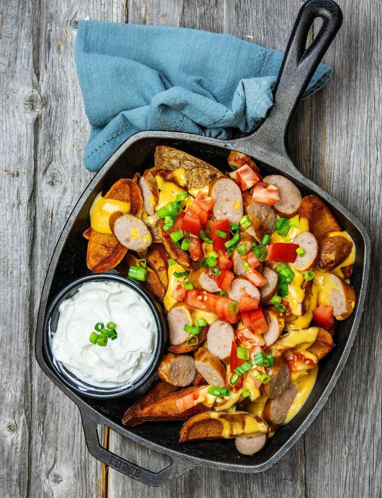 PREP | Cut potato skins into small strips. Deep fry until crispy. Place onto a platter. Top with heated and sliced brats and remaining ingredients, serving sour cream on the side.