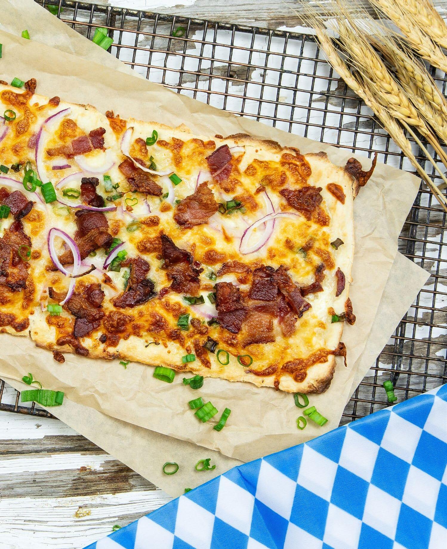 Flammkuchen, also known as “flame cake,” is a traditional dish from the border area between France and Germany. This thin-crusted tart or flatbread is typically topped with creme fraiche, thinly sliced onions and small strips or cubes of cured pork belly.