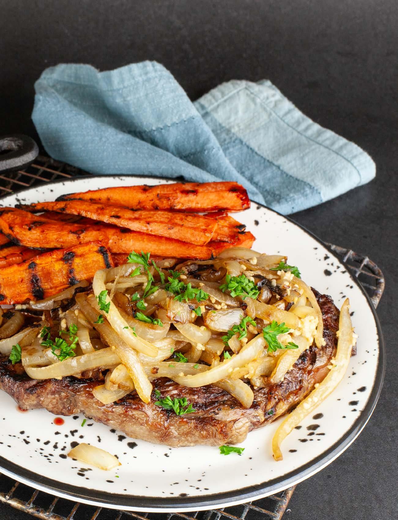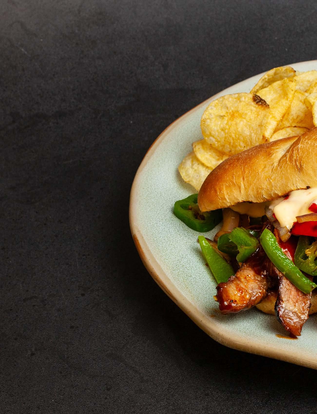 PREP | Saute onions and peppers with olive oil. Season steaks with salt, pepper and garlic before cooking. Cook steaks to customers’ requests, brushing with Gochujang Korean Pepper Sauce during cooking. Let steaks rest for 3 minutes before slicing. Build sandwich with sliced steak, sauteed onions and peppers and sweet chili mayo. Serve with chips.
