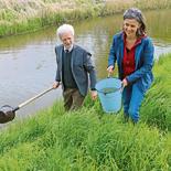 Hand in Hand beförderten die Gäste einen Eimer Peene-Wasser vom Fluss zum Wasserwerk. Christoph Linke vom StALU und Dr. Franziska Tanneberger vom Greifswalder Moorzentrum hatten ihn gemeinsam aus dem Fluss geschöpft.