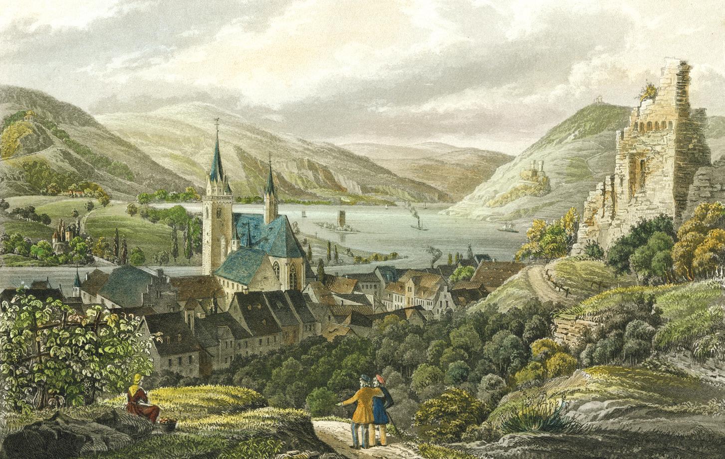 Illustrations: Above: Bonn, steel engraving c. 1840. Opposite: The Rhine at Bingen, lithograph 1834.