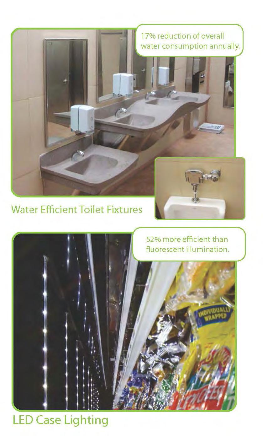 The energy performance in this store exceeds the 10% improvement over the energy performance requirement of ASHRAE/IESNA Standard 90.1-2007. No CFC-based refrigerants were used. The project team utilized high efficiency LED lighting that requires approximately 0.58 watts per square foot on average. This will provide an energy reduction of over 60% from the standard baseline.