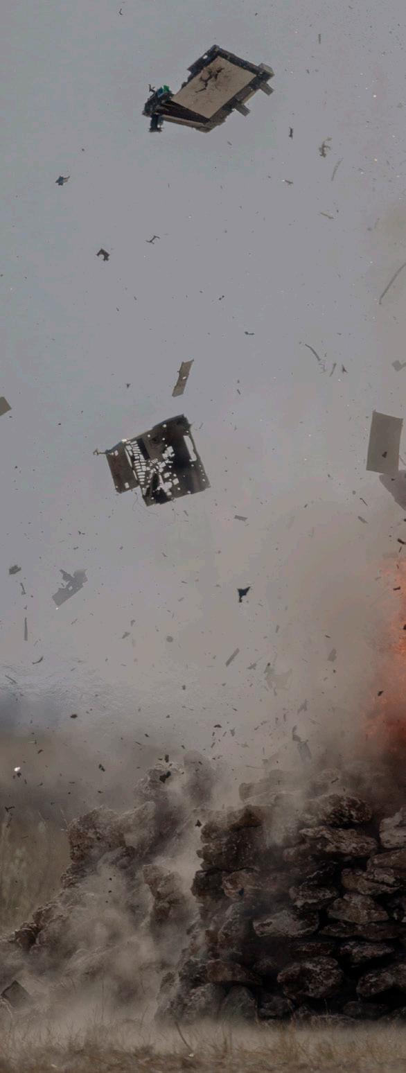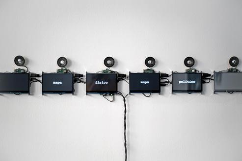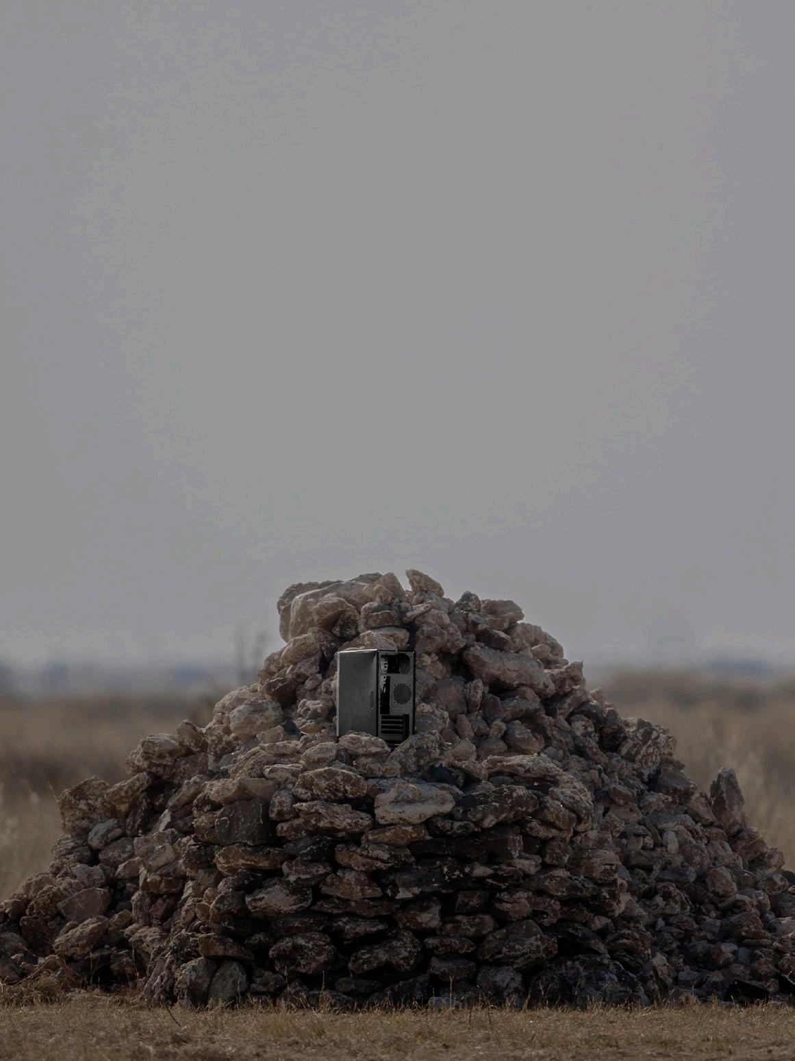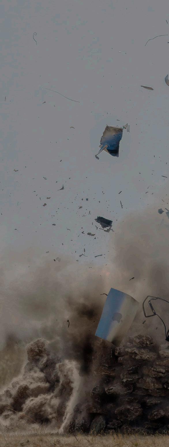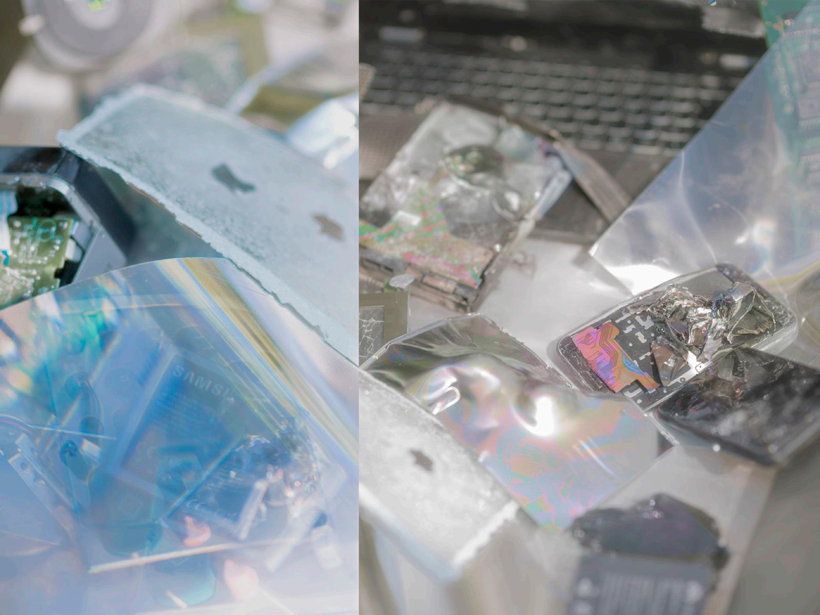 Il progetto di Salvatore Vitale, Death by GPS, è radicale sotto diversi aspetti: evoca al tempo stesso le atmosfere di un laboratorio, di uno studio televisivo e di un luogo che è stato teatro di disordini. Il montaggio in rapida sequenza accosta fotografie documentarie di eventi reali e riprese video di sabotaggi inscenati. Il tutto di fronte a una parete color blu oltremare, a cui è addossata una struttura metallica che funge al tempo stesso da magazzino di stoccaggio e da display. Vitale ci invita a riflettere su tematiche scottanti e divisive, portando alla ribalta la vicenda problematica dell’essere umano che sperimenta sulla propria pelle l’avvento in diretta di una rivoluzione tecnologica che domina azioni e stati d’animo per mezzo dell’automazione dei processi lavorativi e del mercato. Nelle parole dell’artista, “la prima parte di questo progetto a lungo termine è incentrata sulla regione del Gauteng, in Sudafrica, e stabilisce un legame tra la gig economy, l’attività mineraria con le pratiche a essa legate e il concetto di sabotaggio tecnologico. Nello scenario del tardo capitalismo, come conseguenza delle pratiche di esternalizzazione e outsourcing del lavoro, le persone sono ridotte alla stregua di ‘estensioni di software’. Questa posizione paradossale induce i lavoratori a sviluppare nuove strategie di sabotaggio, lotta e sciopero contro quello stesso software” 9. L’artista abbandona più volte la posizione del documentarista, assume lavoratori a salari ragionevoli, fa esplodere strumenti digitali, ad esempio i computer portatili.