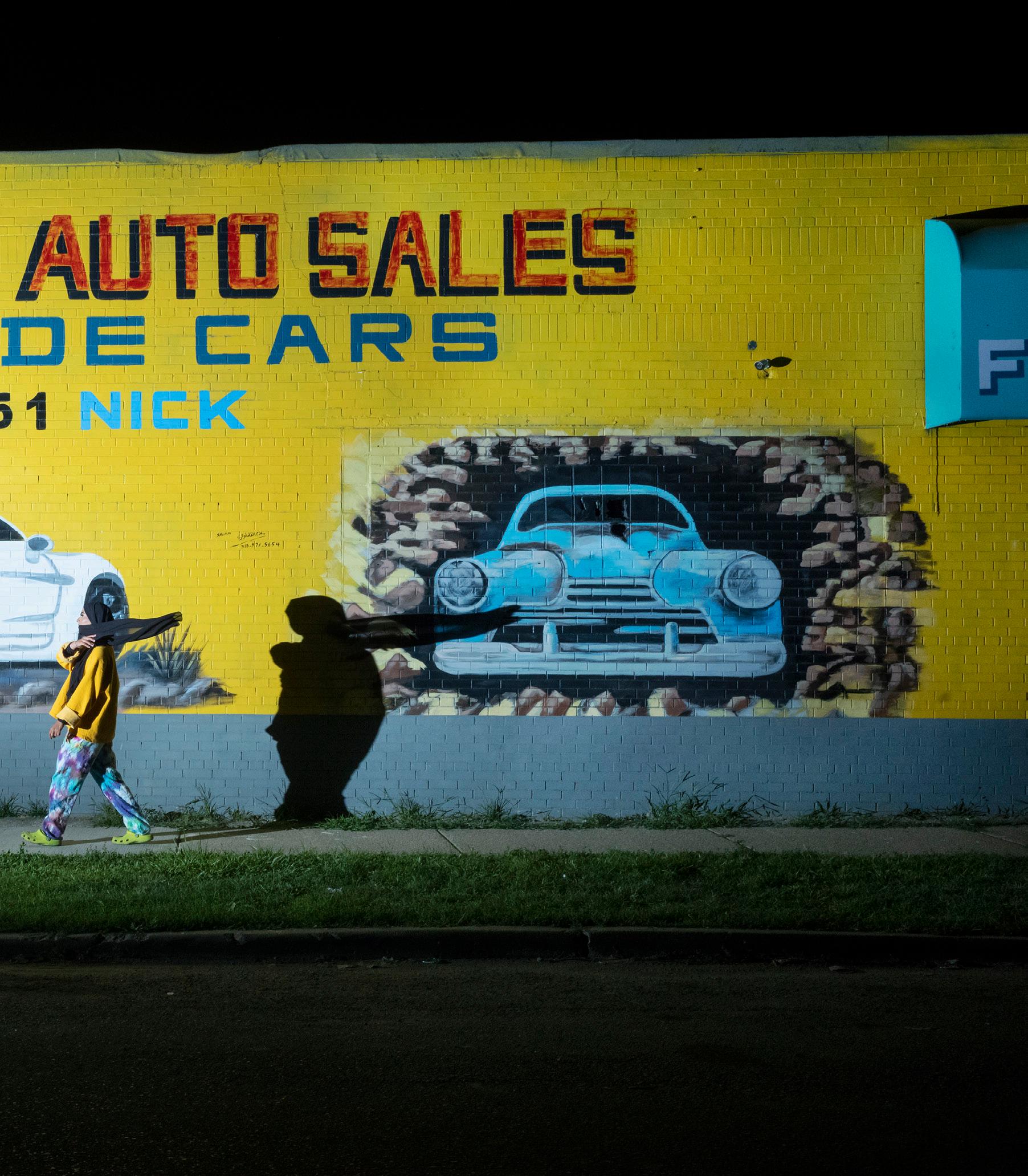 non è permesso fotografare liberamente, ma si è limitata a osservare nel concreto le persone, le loro attività, i momenti di pausa, gli spostamenti per recarsi al lavoro e il riflesso di tutto questo sui muri degli edifici. L’autrice ha creato una sorta di amalgama tra scorci di vita autentici della città e la sua dimensione più patinata e fotografata nei manifesti, tra insegne pubbliche e private. Dearborn mostra un carattere ibrido che è espressione di due culture, quella araba e quella statunitense. In definitiva