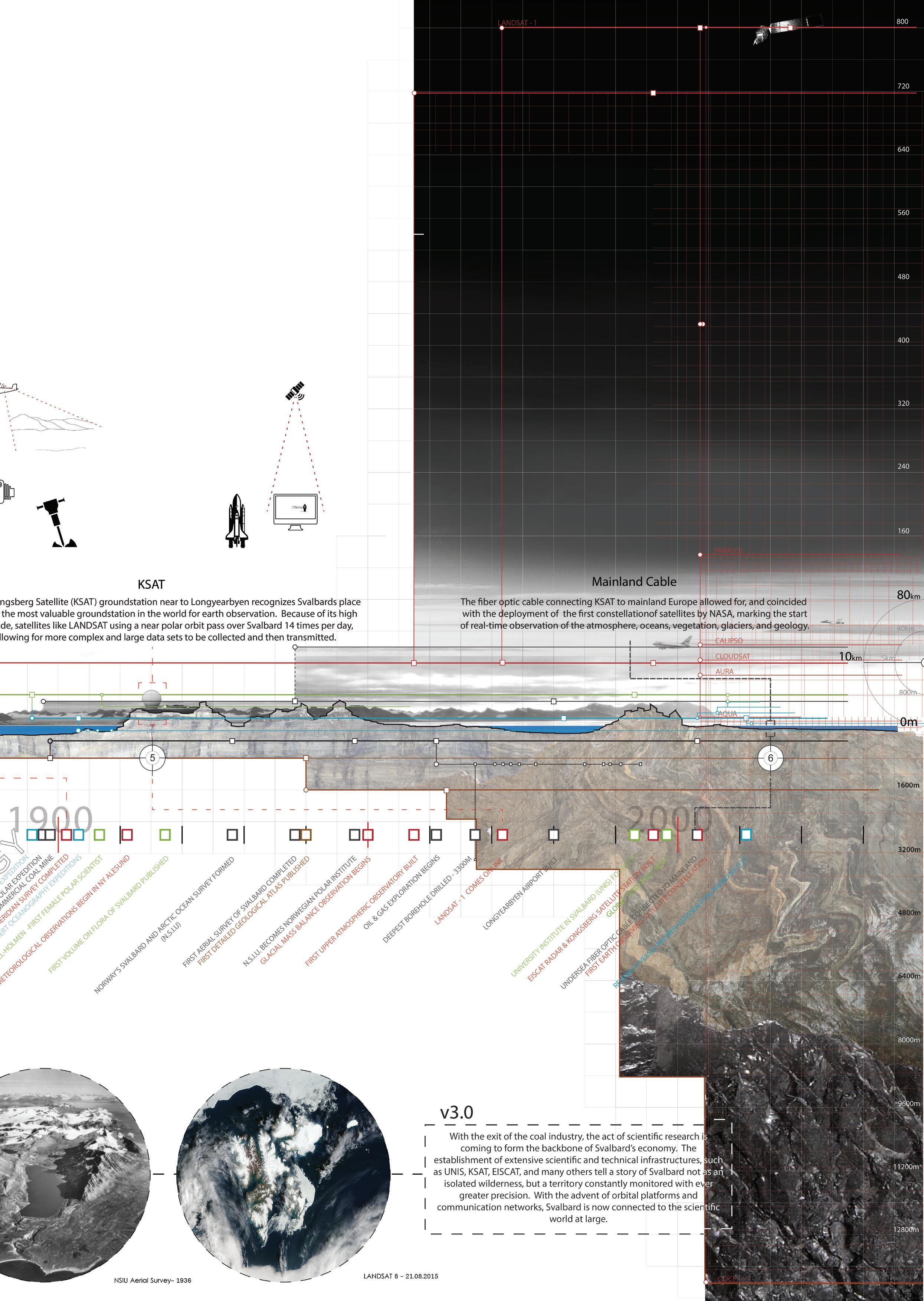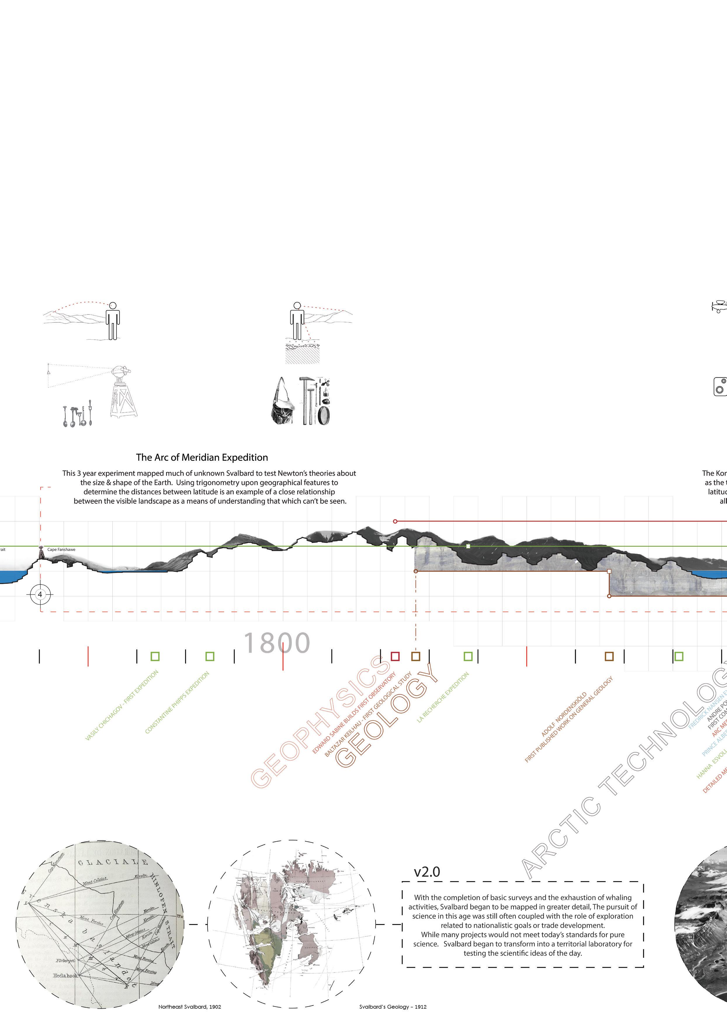 The section cuts across Svalbard at a scale of 1:450 000 and is used to combine spatial information with a larger historical narrative. Svalbard studying the Earth’s magnetic fields in the far North, and continues to describe the evolution of scientific practice across the archipelago graphically where, when, how, and what ways the depth of our understanding has expanded and changed how we perceive and represent