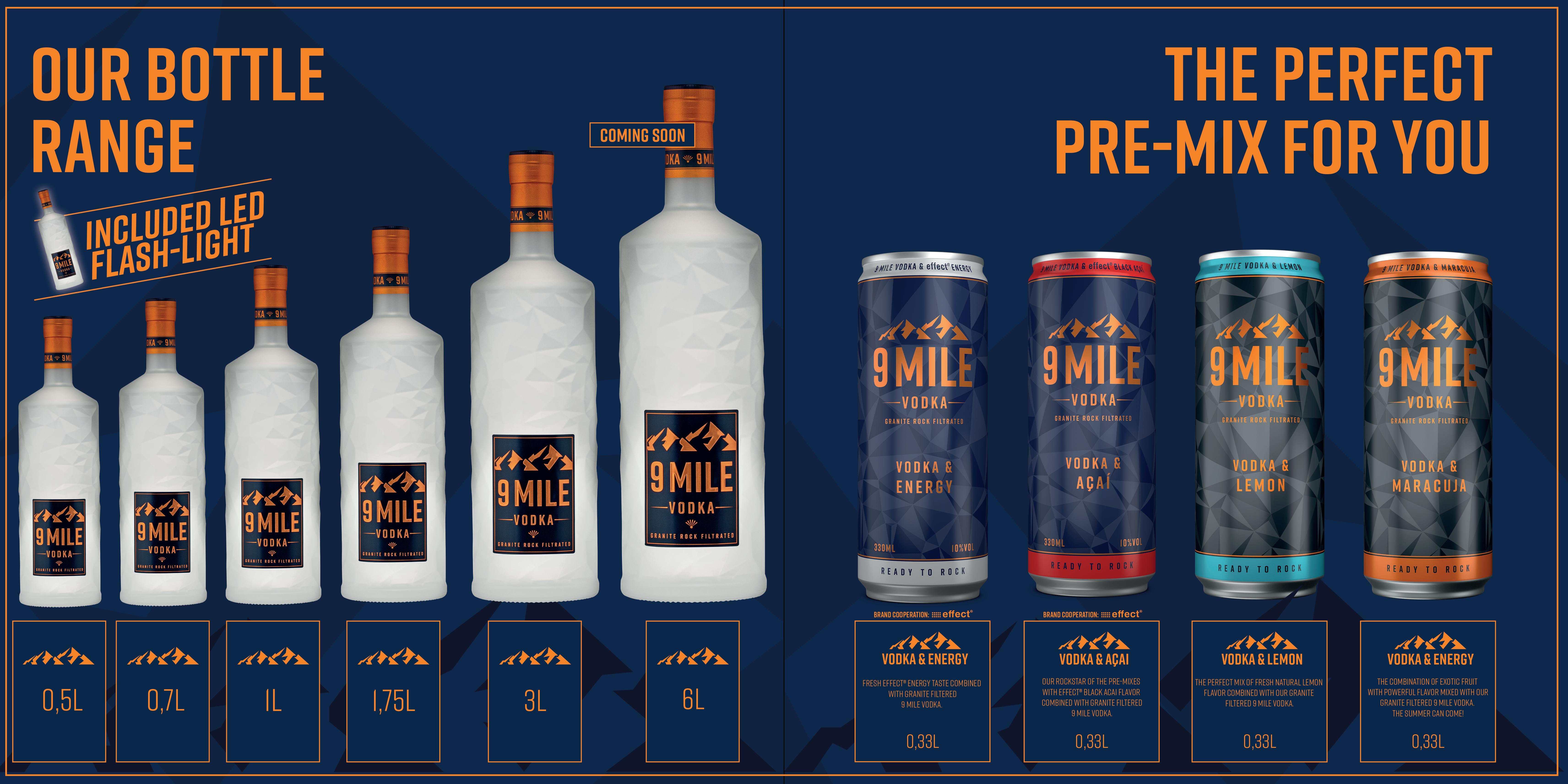 www.9milevodka.com | 9 Mile. Rocks! Granite Rock Distillery GmbH Joachim-Friedrich-Straße 10a | 10711 Berlin | GERMANY info@mbg-online.net | +49 5251 546 0 www.mbgglobal.net