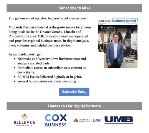 The Midlands Business Journal (ISSN 0194-4525) is published weekly by MBJ Inc. and is available for $2.00 per individual copy, $84 per year (print subscription) or $60 (digital only). Editorial offices are 1308 S. 119th St., Omaha, NE 68144. Periodical postage paid at Omaha NE POSTMASTER; Send address changes to Midlands Business Journal, 1308 S. 119th St., Omaha, NE 68144. All submissions to the Midlands Business Journal become the property of the Midlands Business Journal and will not be returned. EDITORIAL ADVERTISING (402) 330-1760