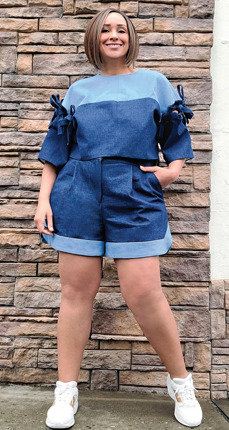 M8585 Brown top and shorts. Earrings & bracelet: Betty Carre.