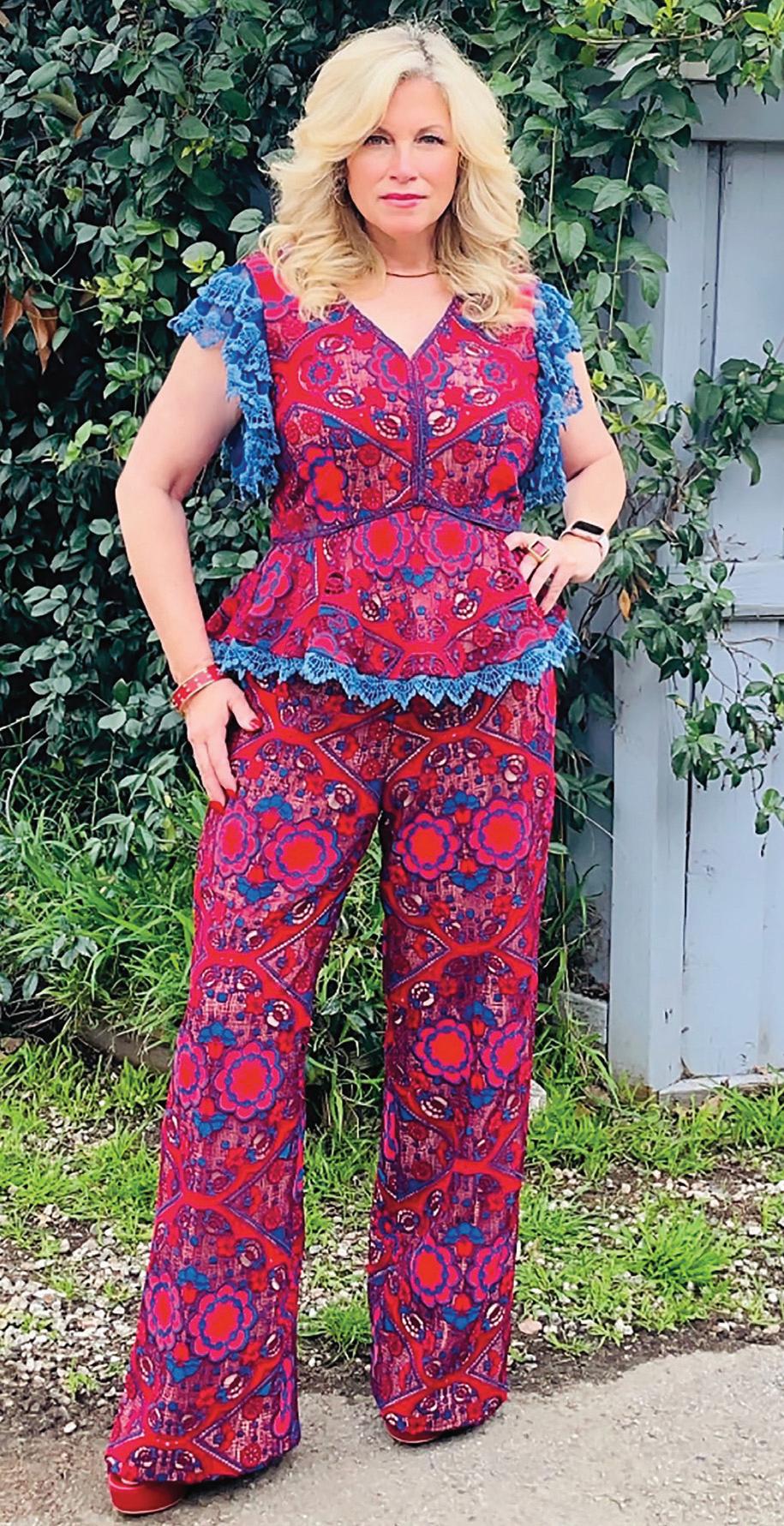 M8512 Red jumpsuit. Earrings & bracelet: Betty Carre.