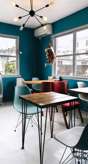 Walking into these repurposed military housing cafés—complemented by the eclectic décor which in this case includes mix-and-match chairs, plants, wall hangings featuring a combination of art, photography, extraterrestrial elements and band merch—ofers the sense of being welcomed into someone’s home. UFO B&S CAFE serves burger paties made in-house using 100% Okinawan Kuroge-Wagyu (with no binding agents) along with crisp iceberg letuce and a slice of fresh tomato sandwiched between buns that are baked fresh daily. Burgers are accompanied by potato wedges.