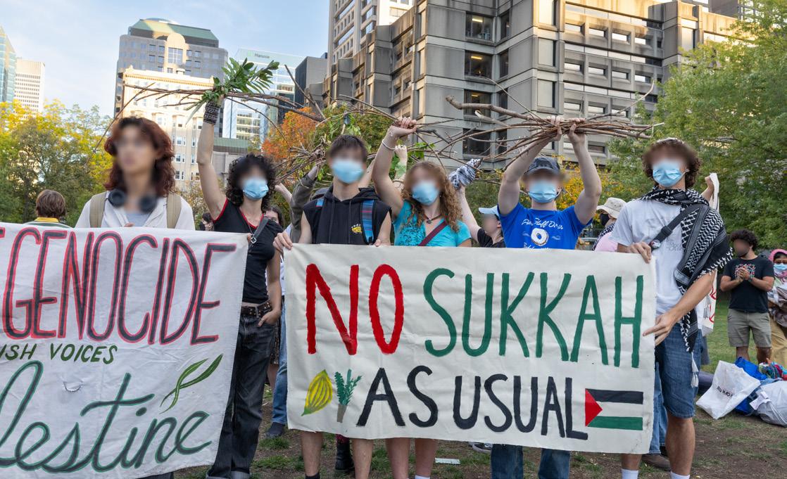 At 4:00 p.m., members of McGill’s and Montreal’s Jewish communities began building the sukkah on the Lower Field using a pop-up tent. Nearly 50 individuals gathered and made speeches, said prayers, sang, and waved four species of plants—citron, myrtle, palm, and willow—as well as banners reading, “Jews against Genocide/Free Palestine,” “Liberate Judaism from Zionism,” and “L’chaim Intifada”.
