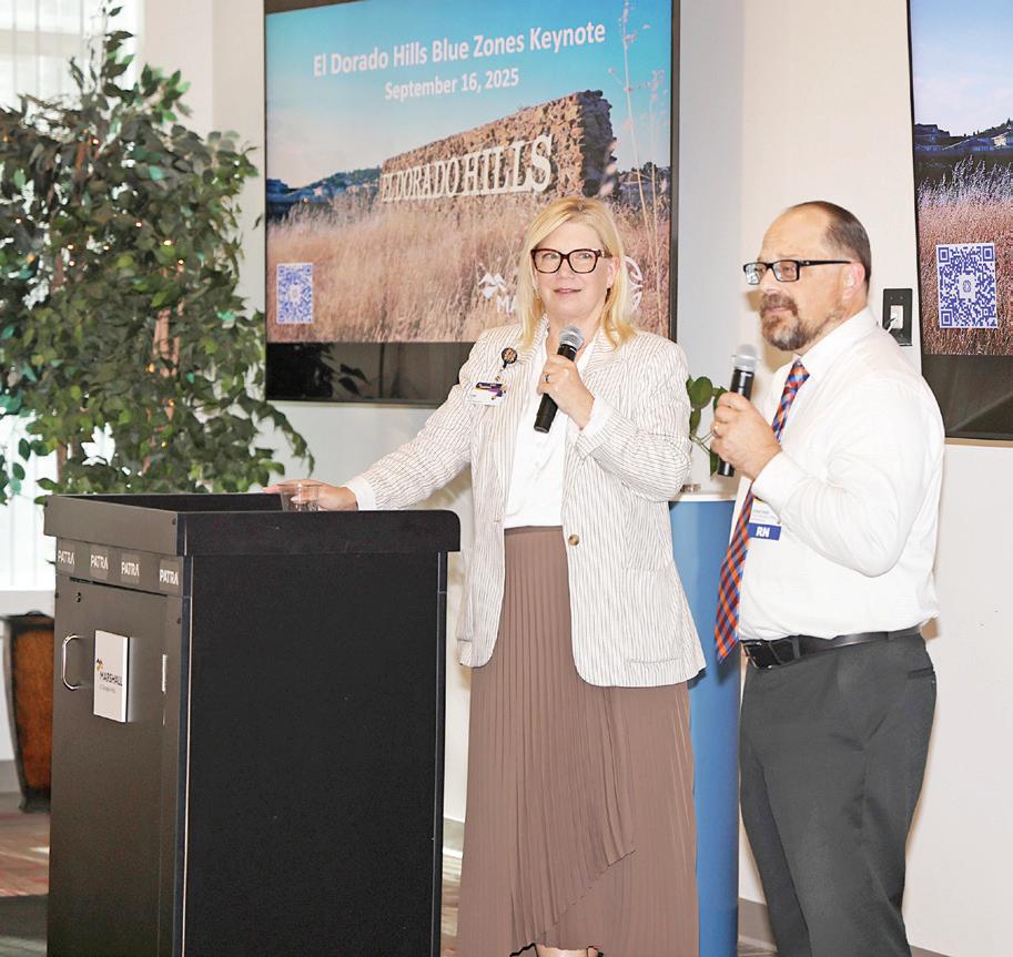 Village Life photo by Shelly Thorene Marshall CEO Siri Nelson, left, and Jonathan Russel, Marshall’s chief ambulatory o cer, speak at the Blue Zones public event in El Dorado Hills on Sept. 16. Marshall has commissioned Blue Zones to conduct a structured assessment to see if the El Dorado Hills area is a good t for the partnership.