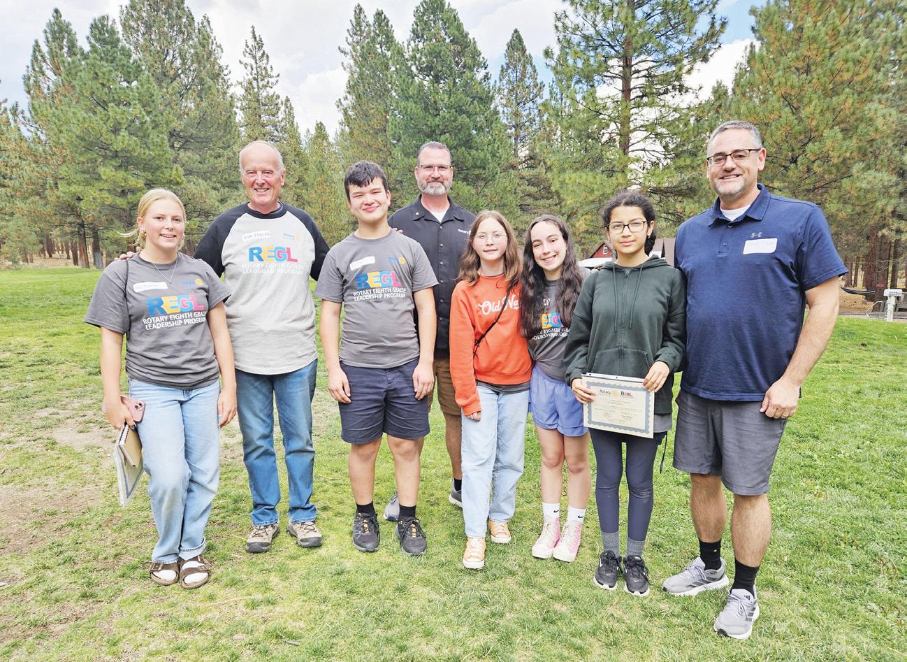 Students Rubi McIntyre, Jesse Marshall, Mallory Bosch, Mara Kelly and Jade Cortez Magana enjoy a leadership camp with Don Fuller, Cameron Park Rotary Youth Services and Area 6 Governor; Adam Marshall, Cameron Park Rotary President; and Doug Shupe, Camerado Springs Principal.
