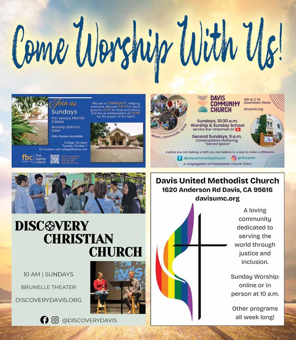 education, encouragement and design.” The group works with city leadership and staff, and other community groups to make Davis streets more bikeable, walkable and livable. They co-host the annual Loopalooza ride to encourage families to get out and ride. They also organize bike registration events to help reduce bike theft, and work with other organizations to donate functional bikes to UCD students in need. Visit www. bikedavis.us or email info@bikedavis.us. • CA House is an unapologetically LGBTQIA+ affirming and welcoming space for the UC Davis student community to explore spirituality, faith and justice in a supportive and caring environment. CA House is home to the Multifaith Living Community, a residential community of 40+ students promoting understanding of difference and diverse experiences. The CoConspiritors group, for students seeking to explore faith and spiritual practices that affirm their full-selves in a mutually supportive and curious environment meets on Mondays from 78:30 p.m. during the academic year. On Wednesdays from 7-8:30 p.m. during the academic year, we host Open Table, a communal vegetarian meal paired with engaging discussions, presenters and