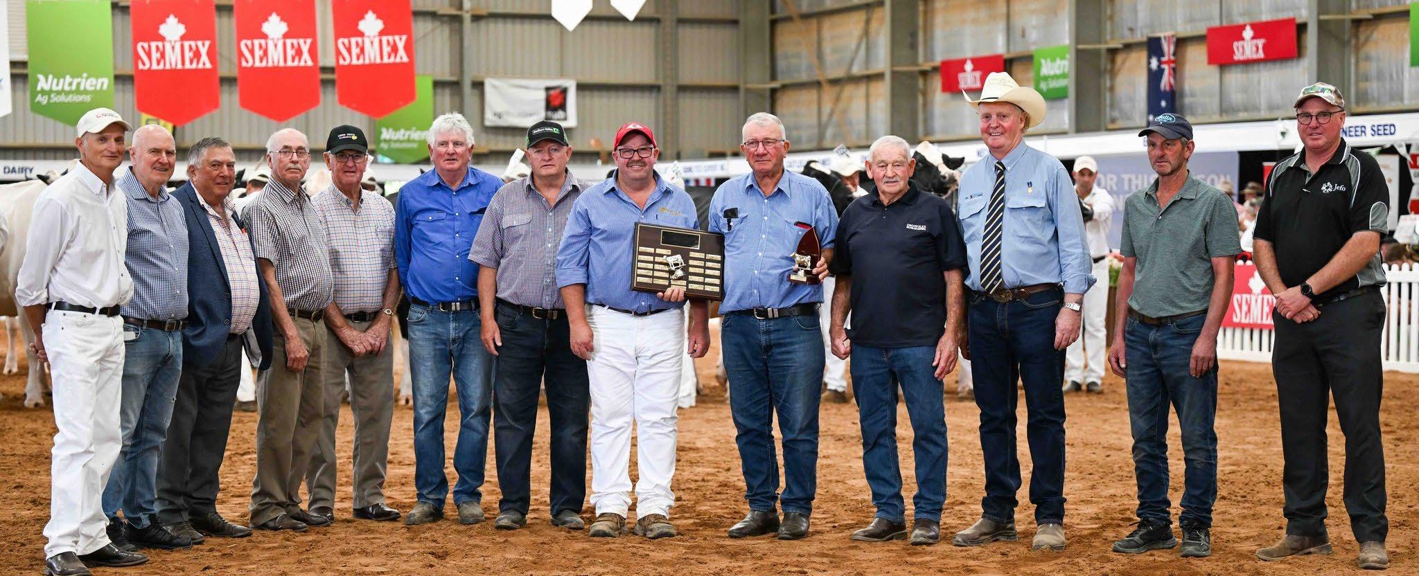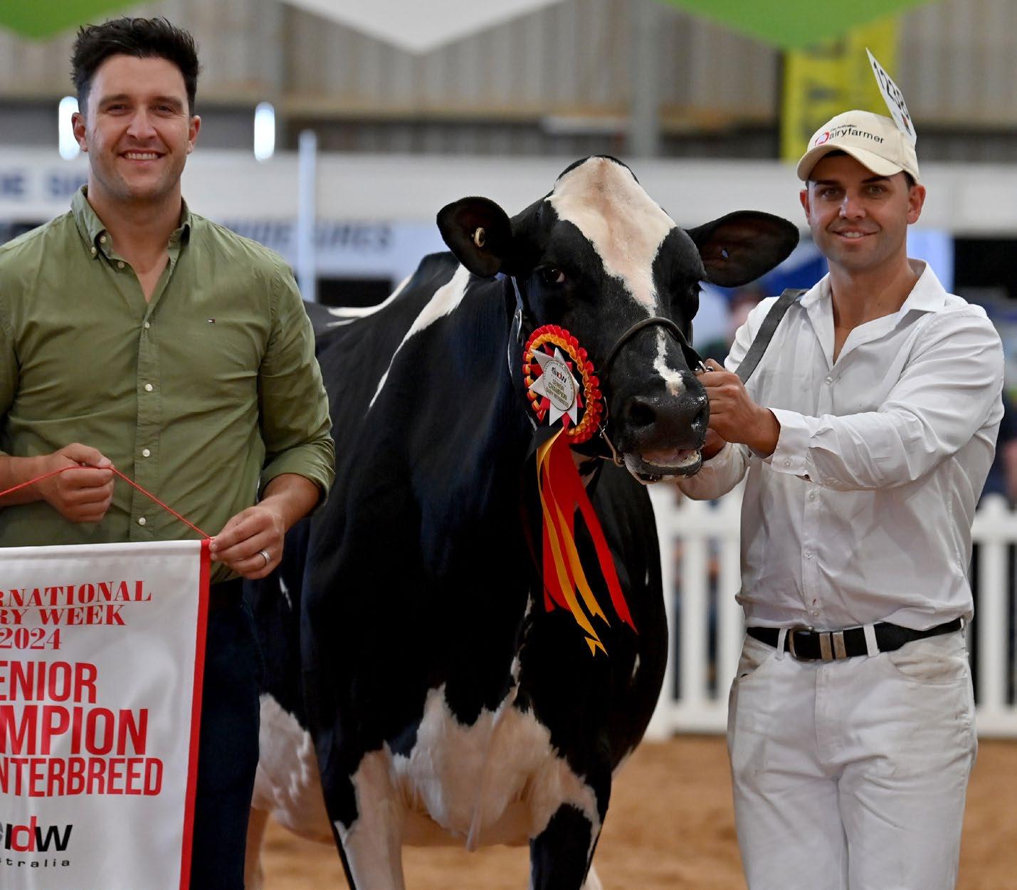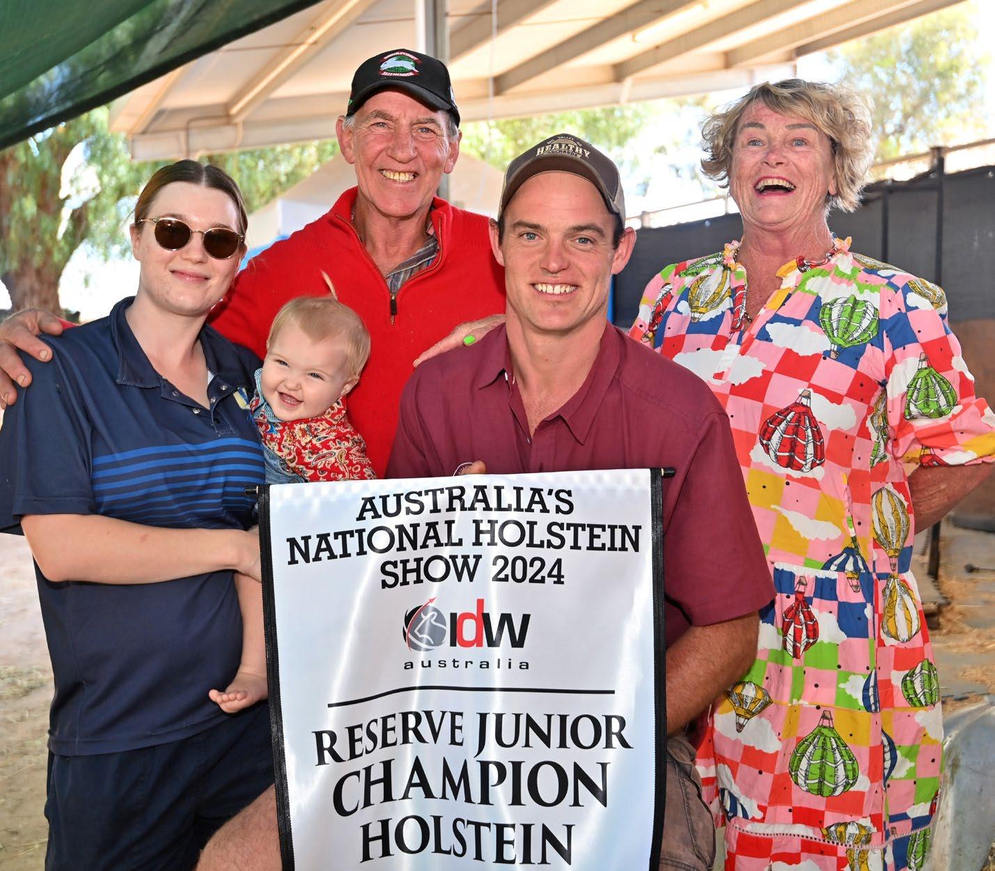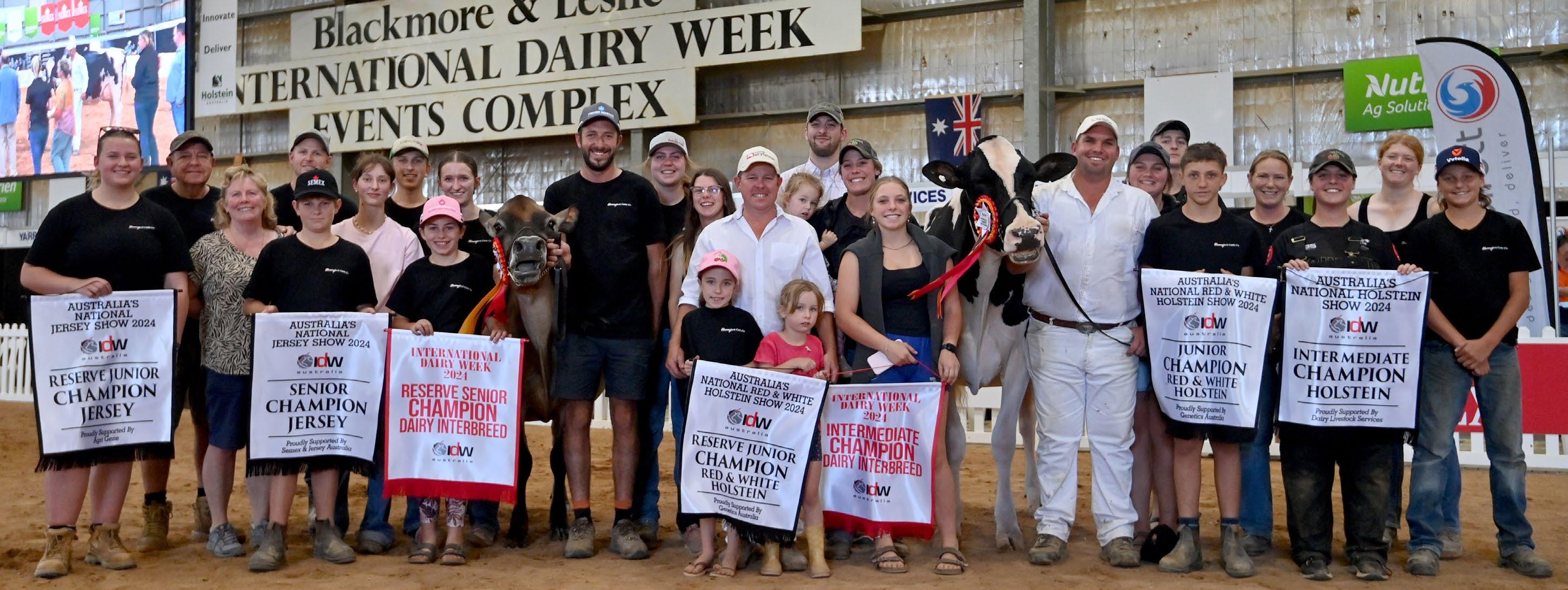 The region boasted many winners at IDW 2024, represented by these happy owners. Among them is the Cherrylock team from Tallygaroopna, taking home InterbreedReserve Champion with the Jersey, Jamber Colton Veronica (co-owned with Robbie Wilson from Jamberoo, NSW), and Intermediate Champion with the Holstein, Eclipse Perennial C Princess (co-owned with M. Polson). (Both cows are pictured.)