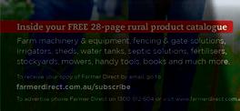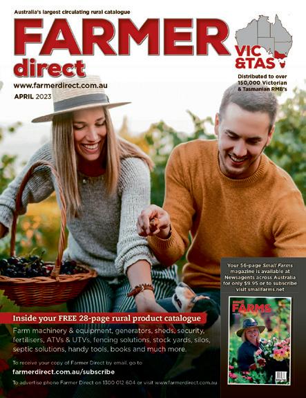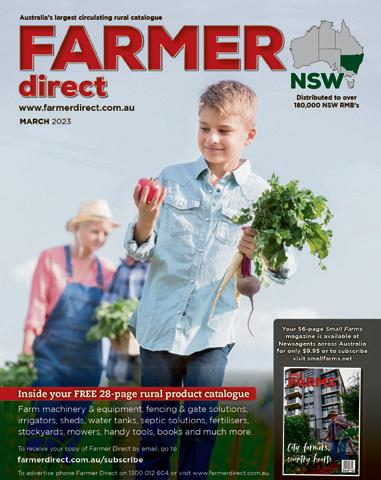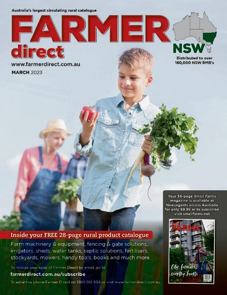 To receive your copy of Farmer Direct by email, go to farmerdirect.com.au/subscribe To advertise phone Farmer Direct on 1300 012 604 or visit www.farmerdirect.com.au Farm equipment, sheds, security, fencing & gate solutions, wood splitters, fertilisers, water tanks, clippers & pruners, poly silos, books, handy tools and much more. Your 56-page Small Farms magazine is available at Newsagents across Australia for only $9.95 or to subscribe visit smallfarms.net Inside your FREE 16-page rural product catalogue www.farmerdirect.com.au Australia’s largest circulating rural catalogue JANUARY 2023 SA &NT Distributed to over 70,000 SA & NT RMB’s 47833.indd 1/4/2023 10:07:18 AM For more information on Farmer Direct advertising, contact: Rob McCracken – 0407 483 872 or email rob.mccracken@farmerdirect.com.au To receive your copy of Farmer Direct by email, go to farmerdirect.com.au/subscribe To advertise phone Farmer Direct on 1300 012 604 or visit www.farmerdirect.com.au Farm machinery & equipment, fencing & gate solutions, irrigators, sheds, fertilisers, septic solutions, trailers, stockyards, sawmills, handy tools, books and much more. Your 56-page Small Farms magazine is available at Newsagents across Australia for only $9.95 or to subscribe visit smallfarms.net Inside your FREE 28-page rural product catalogue www.farmerdirect.com.au Australia’s largest circulating rural catalogue FEBRUARY 2023 QLD Distributed to over 160,000 QLD RMB’s To receive your copy of Farmer Direct by email, go to farmerdirect.com.au/subscribe To advertise phone Farmer Direct on 1300 012 604 or visit www.farmerdirect.com.au Farm machinery and equipment, sheds, mowers, fencing solutions, portable sawmills, fertilisers, silos, handy tools, agricultural books and much more. Your 56-page Small Farms magazine is available at Newsagents across Australia for only $9.95 or to subscribe visit smallfarms.net Inside your FREE 20-page rural product catalogue www.farmerdirect.com.au Australia’s largest circulating rural catalogue MARCH 2023 WA Distributed to over 35,000 Western Australian RMB’s