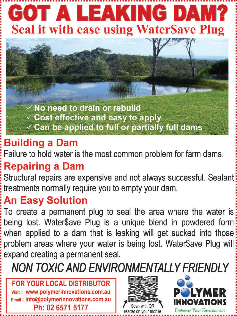 To create a permanent plug to seal the area where the water is being lost. Water$ave Plug is a unique blend in powdered form when applied to a dam that is leaking will get sucked into those problem areas where your water is being lost. Water$ave Plug will expand creating a permanent seal.