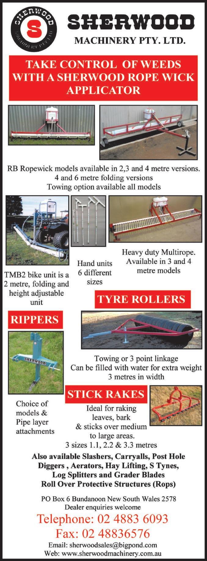 Email: sherwoodsales@bigpond.com Web: www.sherwoodmachinery.com.au Also available Slashers, Carryalls, Post Hole Diggers, Aerators, Hay Lifting, S Tynes, Log Splitters and Grader Blades Roll Over Protective Structures (Rops)
