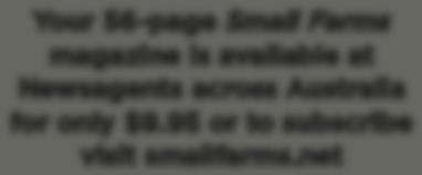 Please forward me a subscription to Small Farms magazine Name Address State P/Code Phone ( ) Email: 12 months (11 issues) $79.00 24 months (22 issues) $149.00 All prices quoted include GST & postage I enclose cheque/money order for $ made payable to Pulse Hub PTY LTD or charge my credit card Mastercard Visa Cardholders name Cardholders signature Card Number Expiry date / CCV Number Small Farms magazine is an independently owned and operated publication by McPherson Media Group, P.O Box 204, Shepparton, Victoria, 3632. Ph 1300 012 183 www.smallfarms.net info@smallfarms.net subscribe today • Ideas about how to get more value from your land • Best practice guides to managing your block or farm