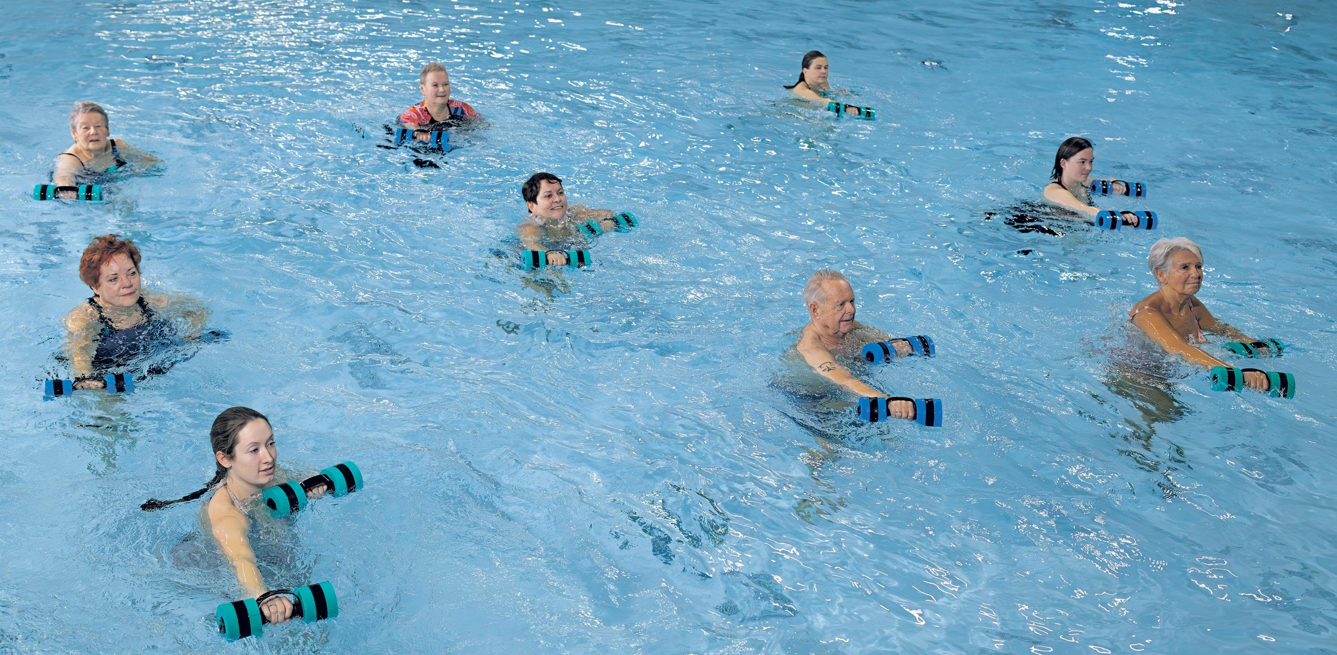 water. Hiermee houd je je spieren en gewrichten soepel zonder ze zwaar te belasten en blijf je lekker lenig. Onder begeleiding van onze ervaren instructeurs doe je verschillende oefeningen die goed zijn voor de mobiliteit, maar tegelijk ook ontspannend kunnen zijn. Iedereen kan op zijn eigen niveau meedoen. Deze gymnastiek in het water vindt plaats in sta-diep water en is dus ook geschikt voor de nieten minder geoefende zwemmer.