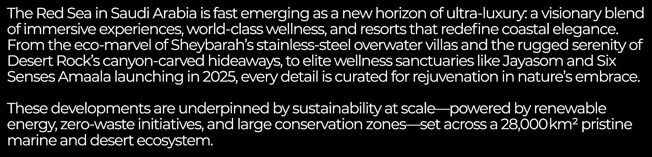 Saudi Arabia is boldly redefining the future of luxury with its ambitious Red Sea and Amaala projects set along one of the world’s last untouched coastlines This transformative vision brings together immersive travel, high-end wellness, and eco-conscious design to create a destination unlike any other.