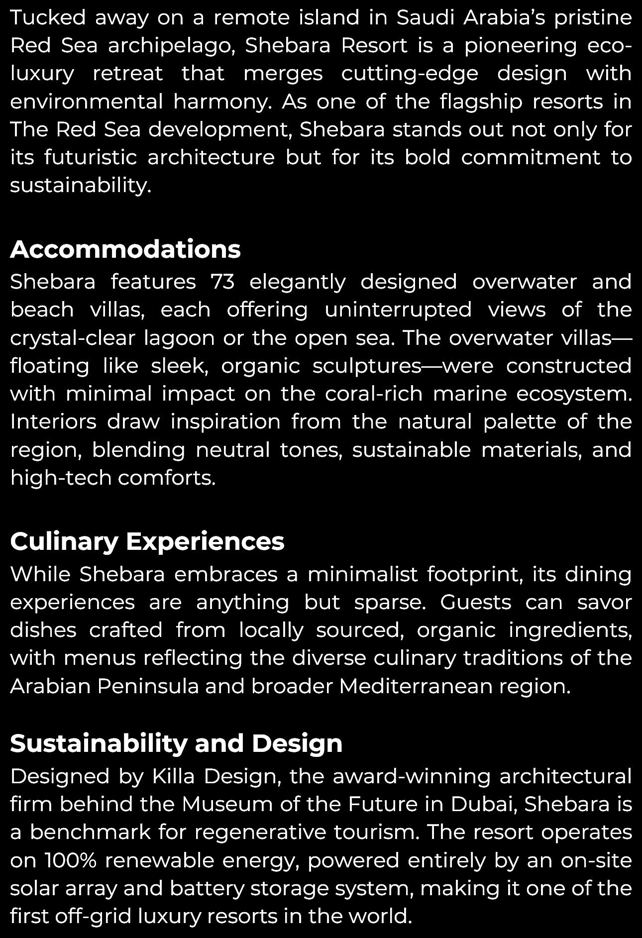 At the heart of this evolving destination lies a new standard of luxury Explore Desert Rock, a resort sculpted into ancient mountains, where raw terrain meets refined design Discover Shebara, a pioneering eco-luxury escape with futuristic overwater villas floating above coral-rich waters. Unwind at Nujuma, a RitzCarlton Reserve, set on a secluded island that offers both serenity and sophistication. Or indulge at The St. Regis Red Sea Resort, where timeless elegance meets untouched natural beauty These flagship properties aren’t just places to stay they’re immersive gateways into the Red Sea’s most breathtaking landscapes