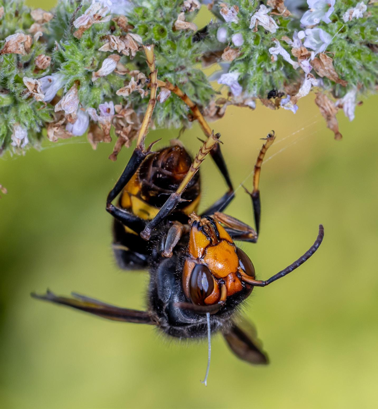 Kopaanzicht Aziatische hoornaar. © Paul Wouters en Marianne Horemans, weidebeekjuffer © Gilbert Reypens, glasvleugelpijlstaart © Maarten Willems, gewone kameleonspin © Sindy Puttenaers , kleverig koraalzwammetje © Mirella Bruynseels.
