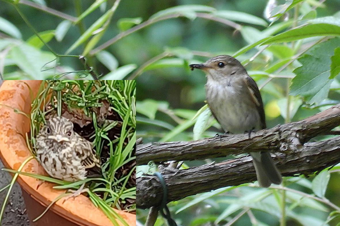 De zeldzame grauwe vliegenvanger nestelt wel eens in onze tuinen. Hier wacht hij om zijn kleintjes te voederen tot Staf uit de buurt is. En Rais kon een op voedsel wachtend jong in de tuin fotograferen.