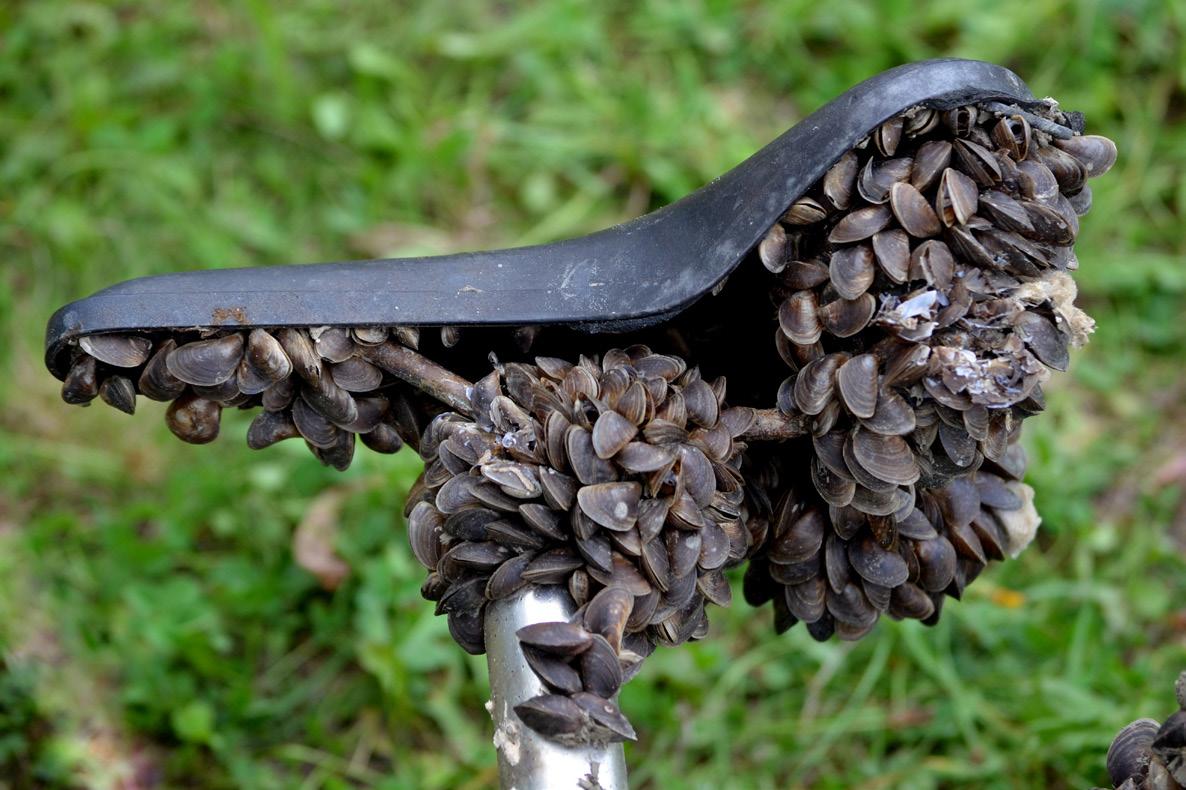 Zoetwatermosselen onder het zadel van een fiets, opgevist aan de brug in Hoolsterberg, Balen. Ze hoorden thuis in de Dnjepr in Oekraïne en hadden een lokaal verspreidingsgebied in de afwatering van de Zwarte Zee. Sinds de jaren 1980 hebben ze veel rivieren in Oost- en West-Europa gekoloniseerd. In Vlaanderen komt de quaggamossel voor sinds 2009.