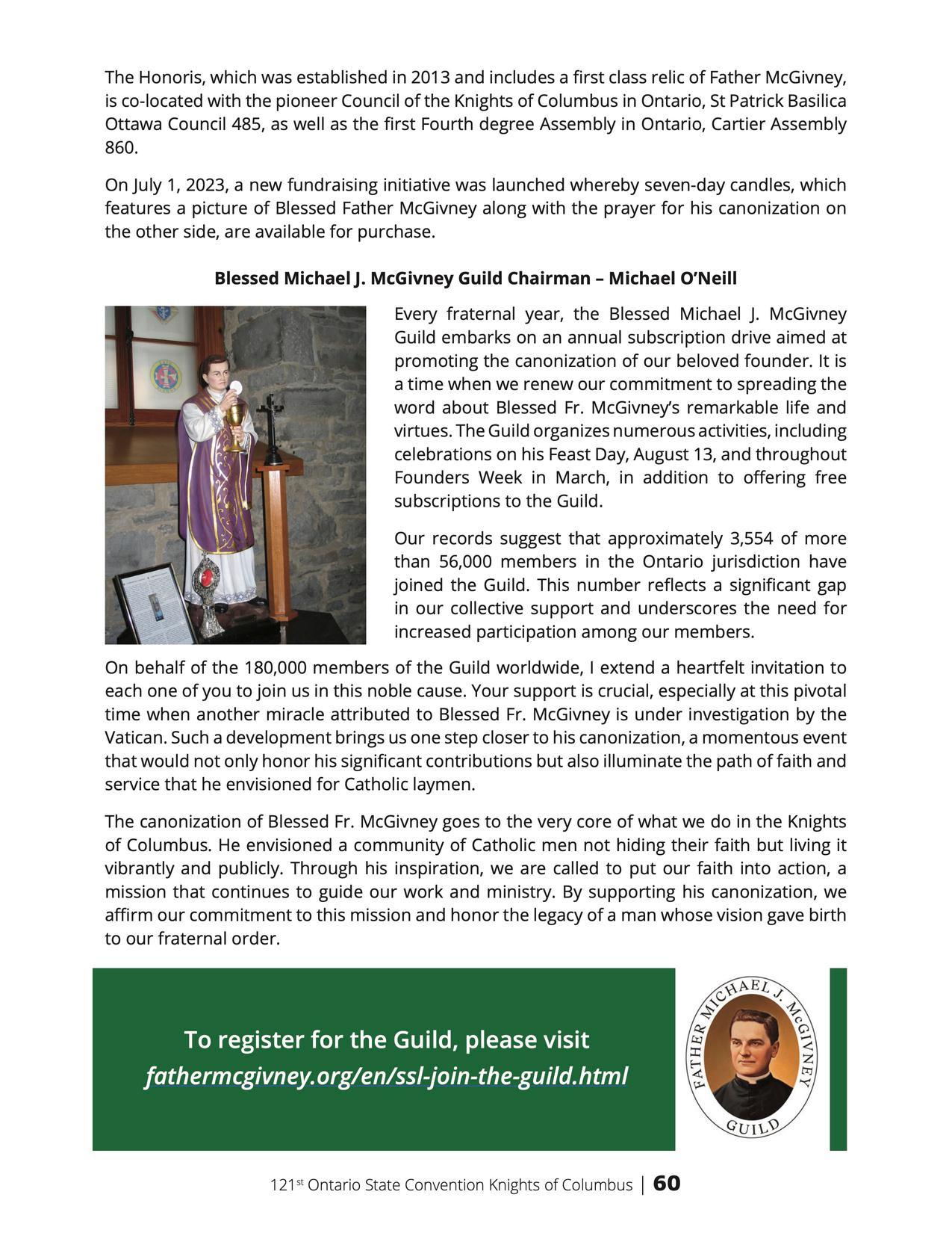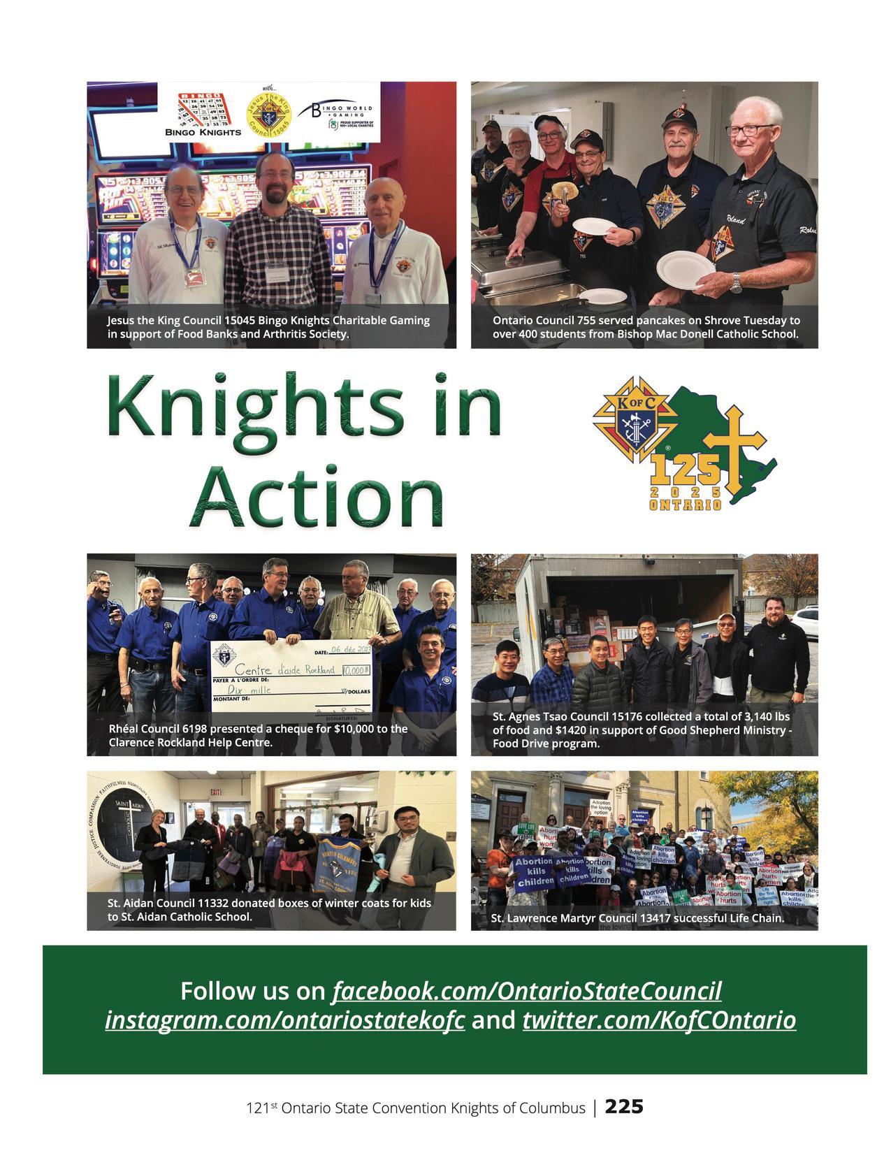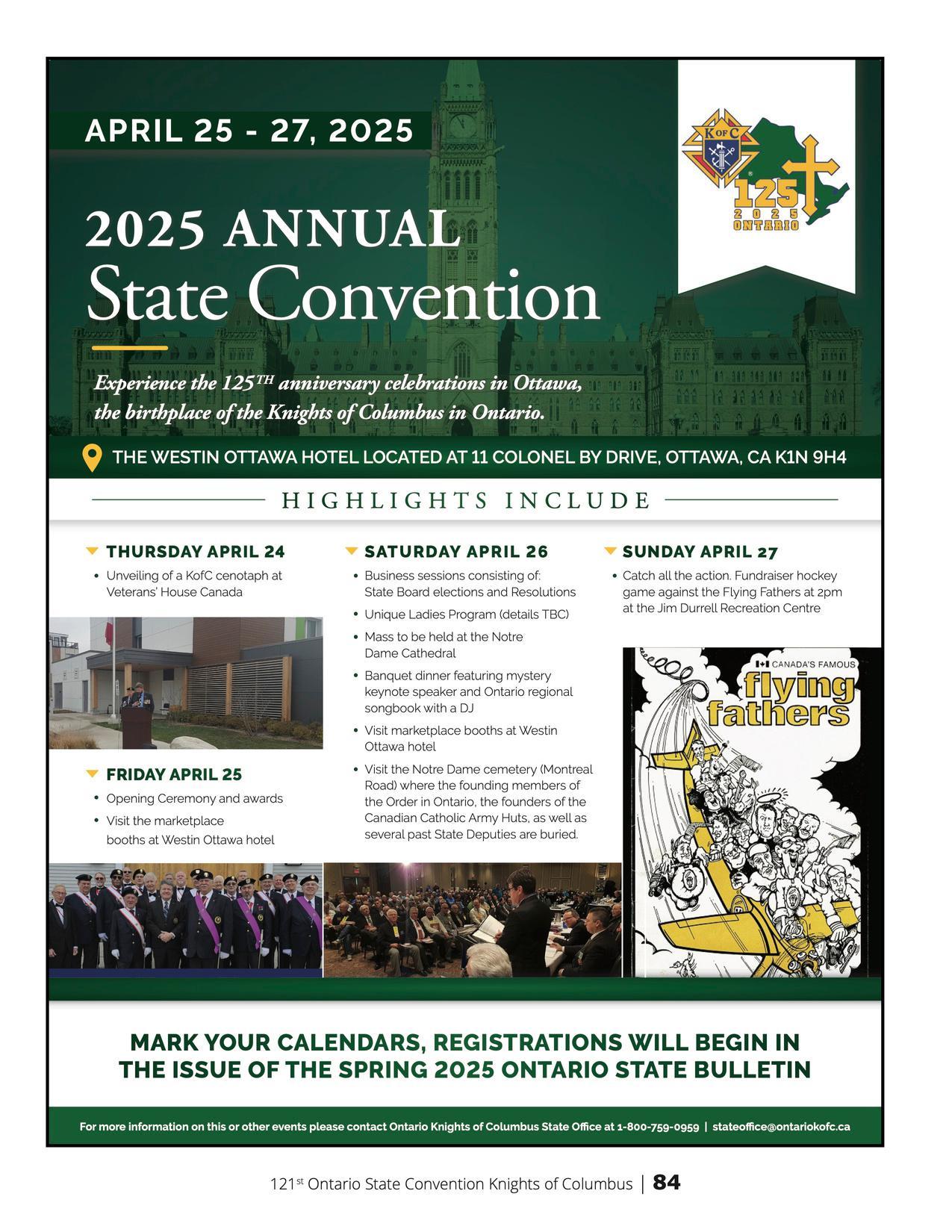 To that end, we have dedicated this issue to the 2024 annual State Convention wherein all those who were not able to attend this year’s convention may still be informed about some of the important milestones we have achieved this year and what the next fraternal year holds for the members of the Knights of Columbus in Ontario.
