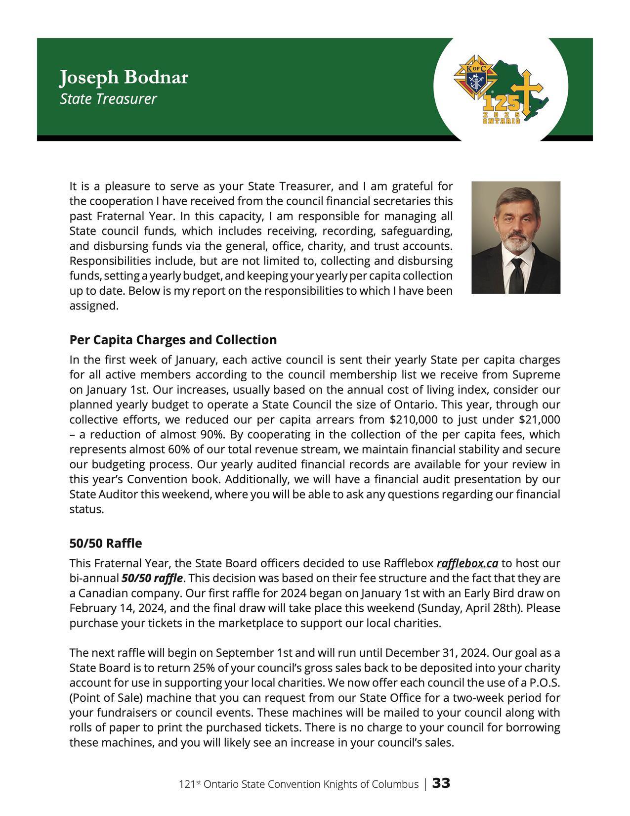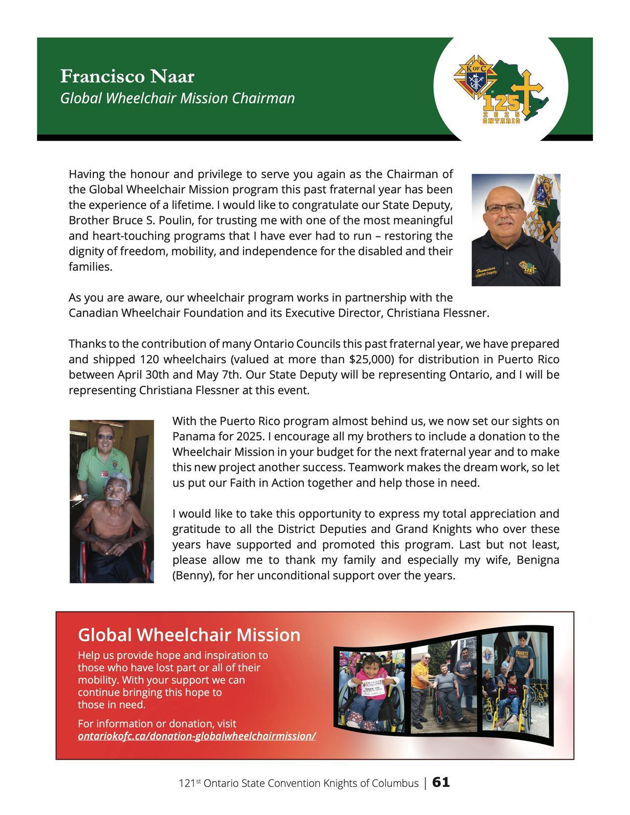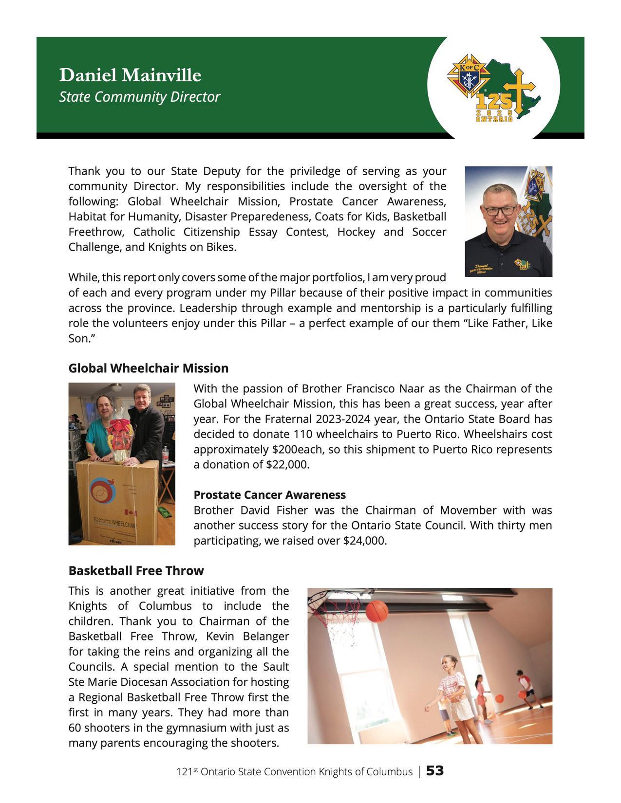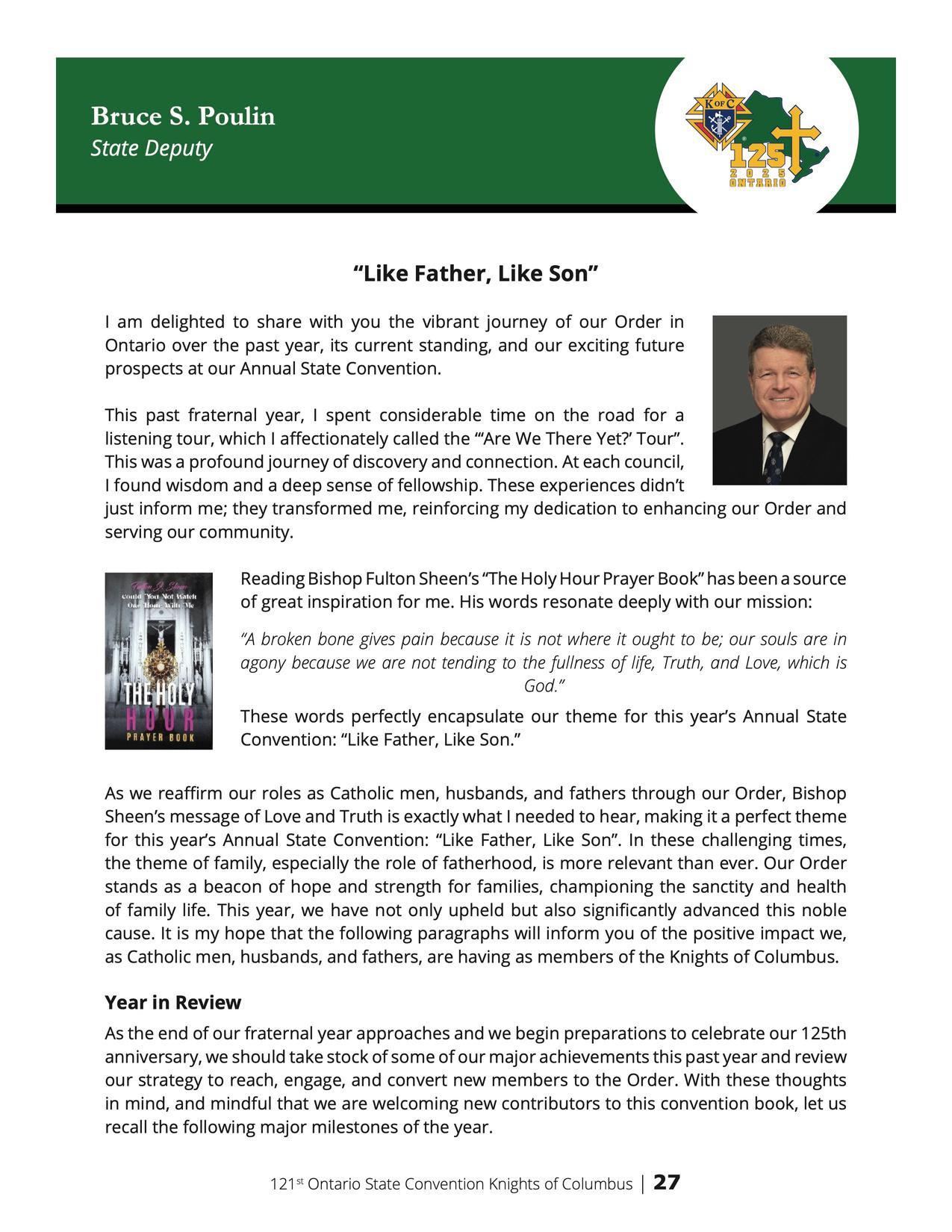 To that end, we have dedicated this issue to the 2024 annual State Convention wherein all those who were not able to attend this year’s convention may still be informed about some of the important milestones we have achieved this year and what the next fraternal year holds for the members of the Knights of Columbus in Ontario.