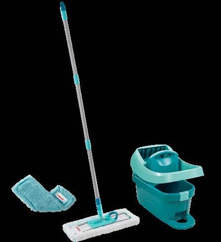 Stiellänge ca. 146 cm, Wischbreite ca. 42 cm, 360°-Kardangelenk, Eimer mit Wischtuchpresse und Rollen, Auspressen per Fußbedienung. Inkl. Wischbezug „micro duo“.