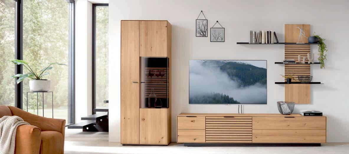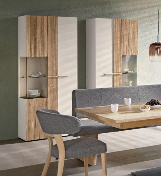 SCHLAFZIMMER-KOMBINATION, dieses Modell transportiert den Charme der Berge direkt in Ihr Schlafzimmer. Schwebend und erhabend verbinden sich hier Tradition und Moderne zu einer harmonischen Schönheit. Hier in Wildeiche massiv, Absetzungen in Hirnholz und Mattglas Kubanit. H70002