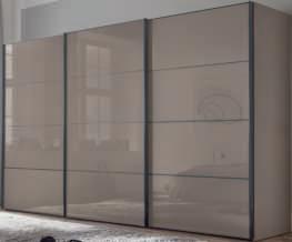 SCHWEBETÜRENSCHRANK, 3-türig, Front Moccaglas, Korpus Dekor mocca, Griffund Zierleisten graphit, ca. B280/H222/T68 cm.
