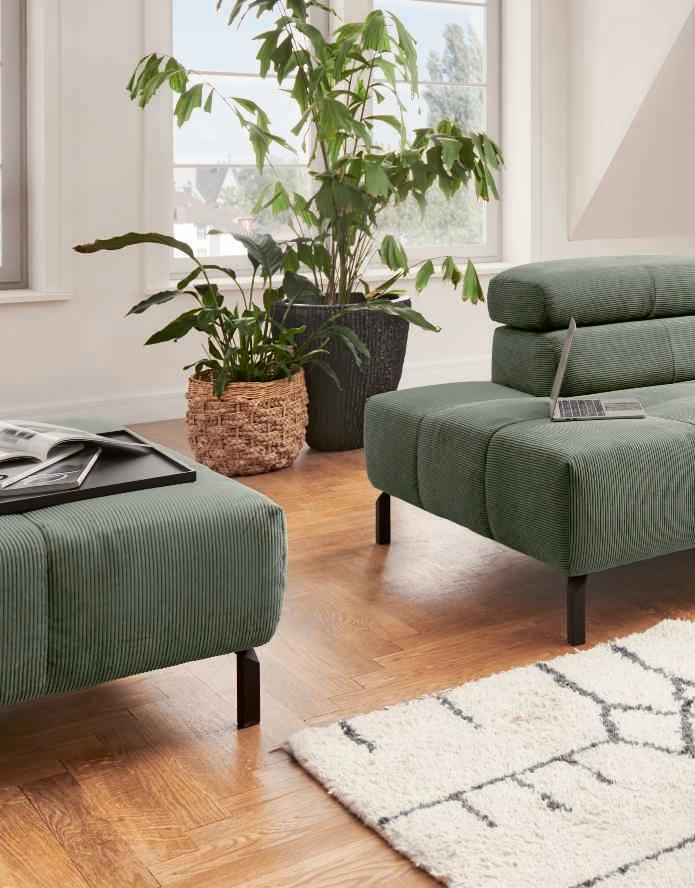 Bezug Stoff Feincord oliv, Metallfuß schwarz matt, best. aus: Umbauecke links und 2-Sitzer mit Armteil rechts, inkl. Kopfteilverstellung an allen Elementen, Stellmaß ca. 219x276 cm. Bezug: 95% Polyester, 5% Nylon 196115