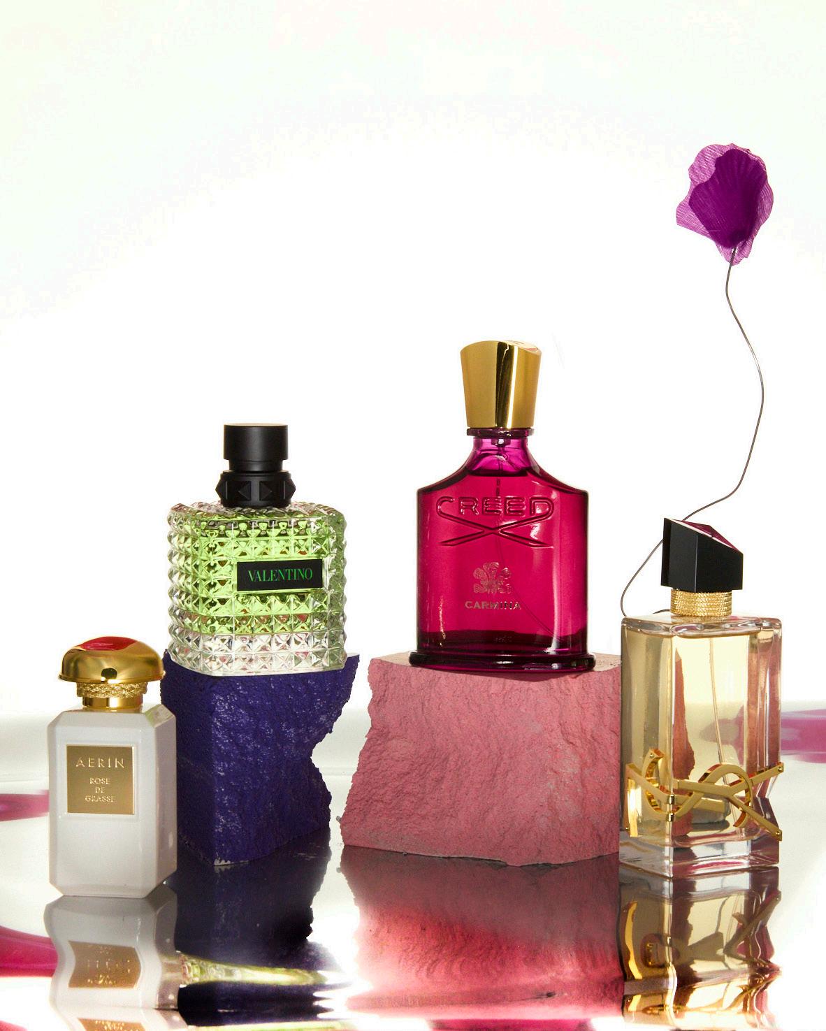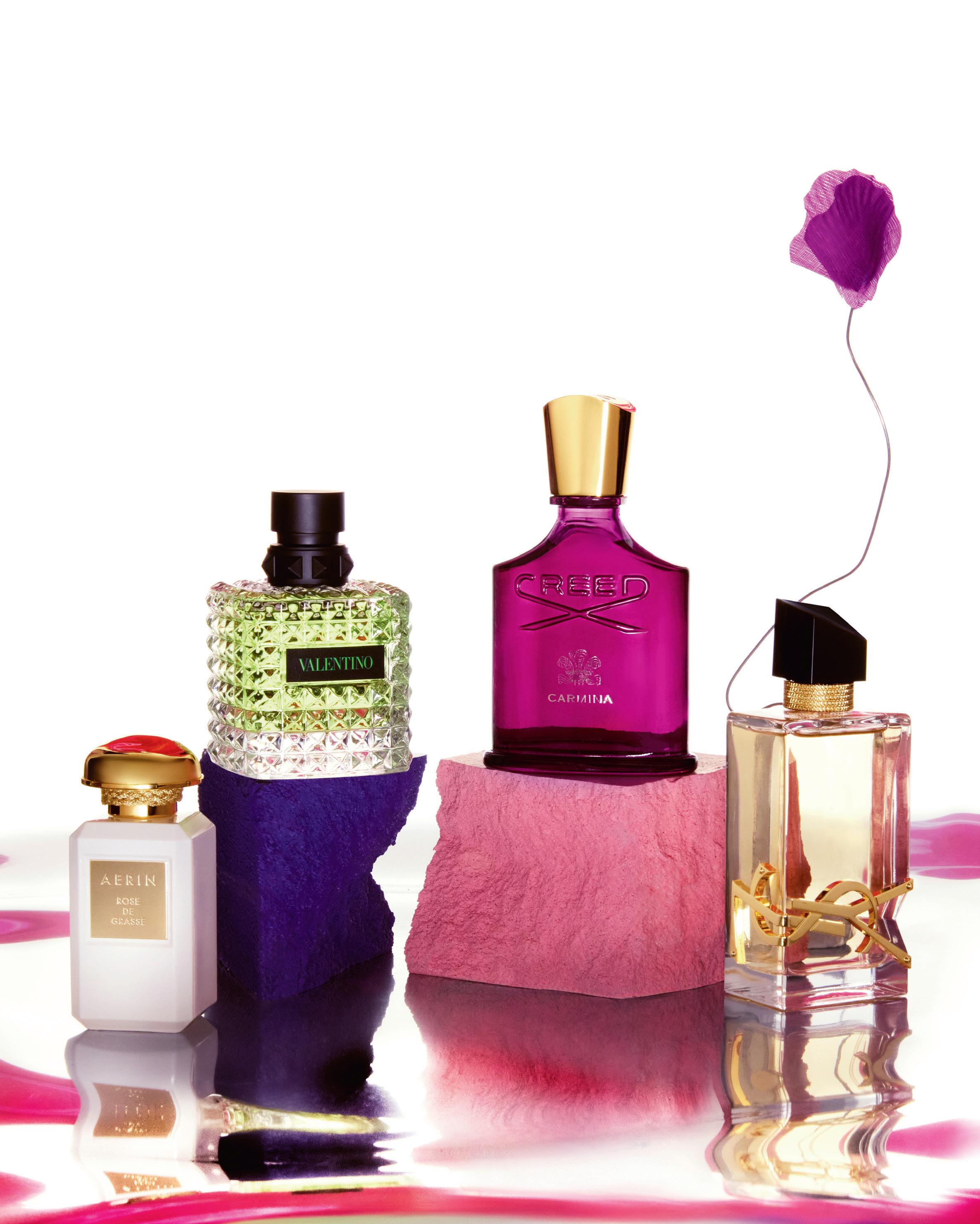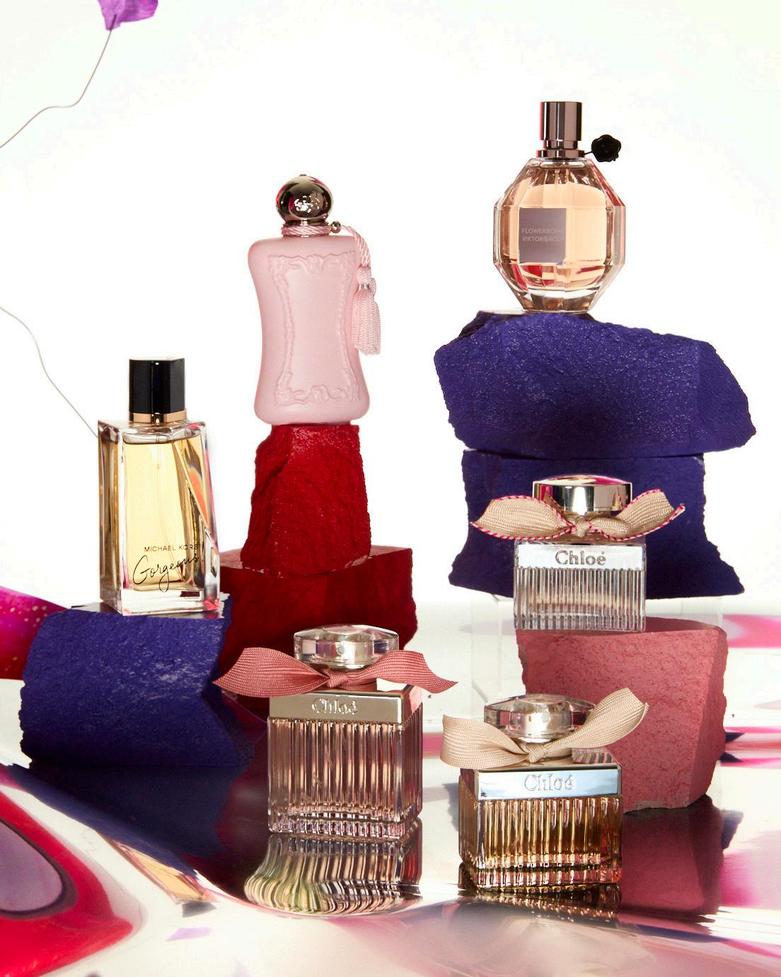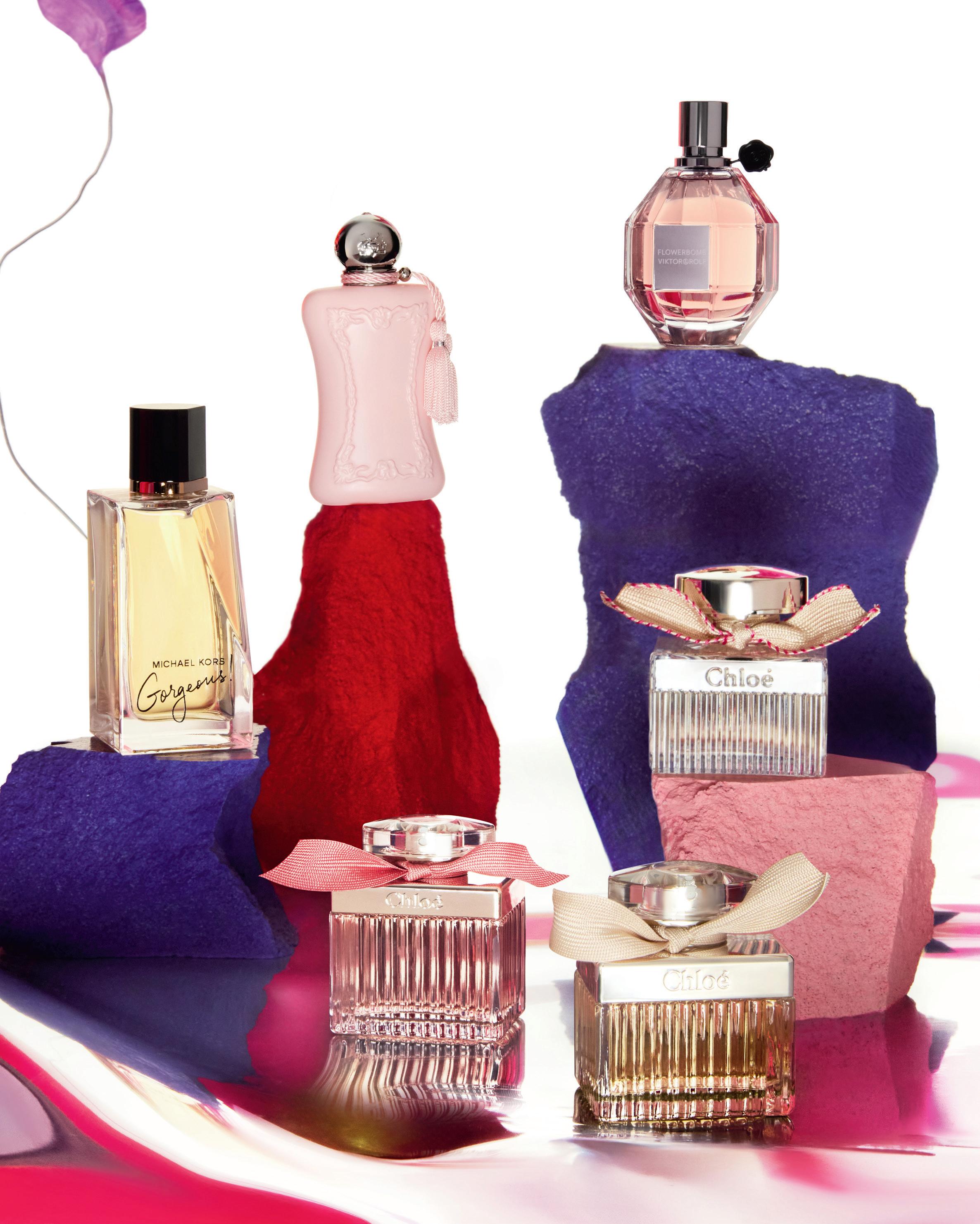 Clockwise from left: MICHAEL KORS Gorgeous! Eau de Parfum 100ml, $152. PARFUMS DE MARLY Delina Eau de Parfum 75ml, $489. VIKTOR & ROLF Flowerbomb Eau de Parfum 100ml, $282. CHLOÉ Eau de Parfum Lumineuse 50ml, $191, Eau de Parfum 50ml, $180, and Roses de Chloé Eau de Toilette 50ml, $148.