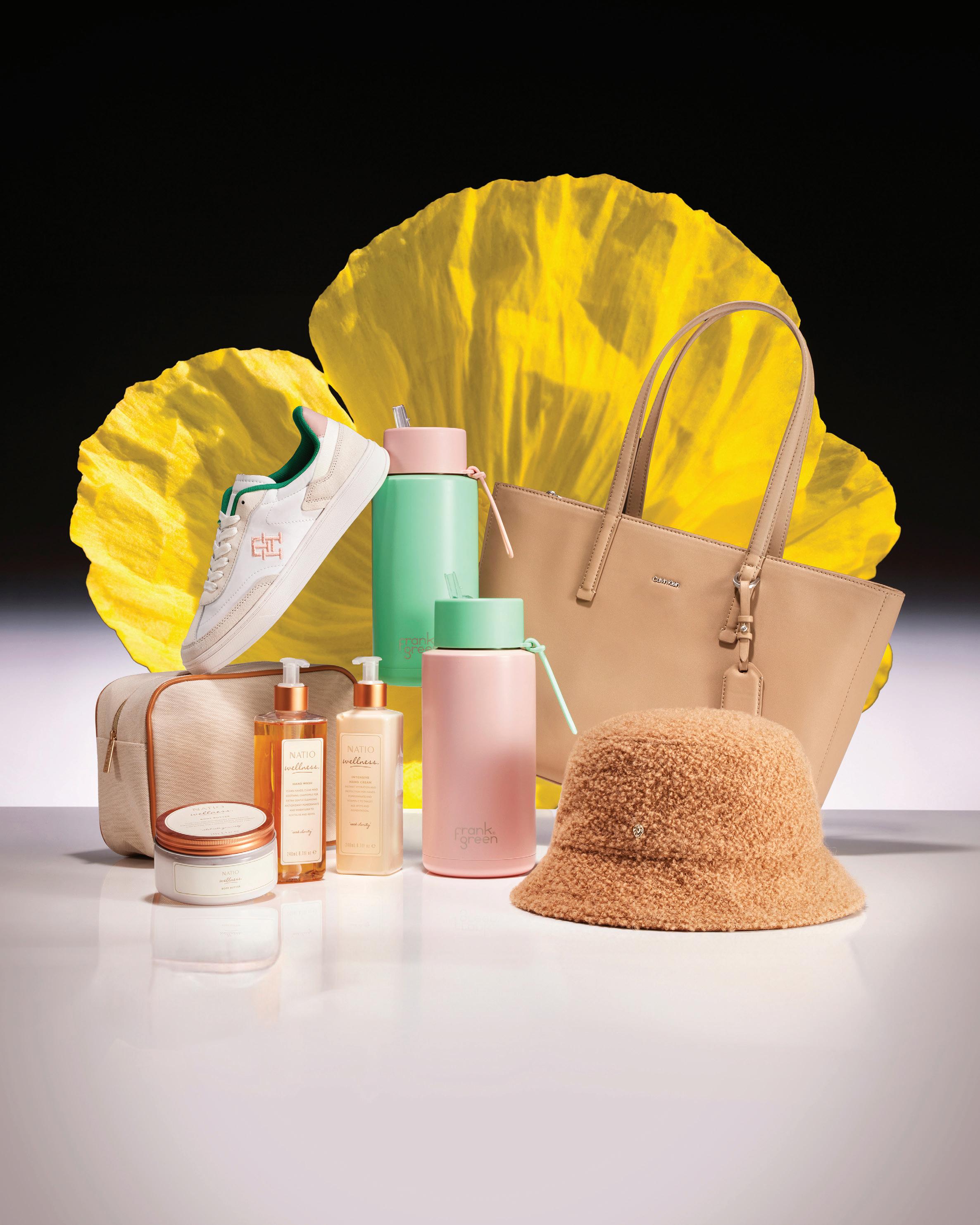Clockwise from top left: TOMMY HILFIGER ‘TH Heritage’ court sneakers, $169. FRANK GREEN ‘Iconic Duo’ 1L Bottle Gift Set in blushed and mint gelato, $109.95. CALVIN KLEIN Mini-quilt tote bag (medium), $269. HELEN KAMINSKI ‘Mackenzie’ bucket hat, $275. NATIO Golden Bouquet Gift Set, $39.95. Includes: Wellness Body Butter 240g, Hand Wash 240ml and Intensive Hand Cream 240ml