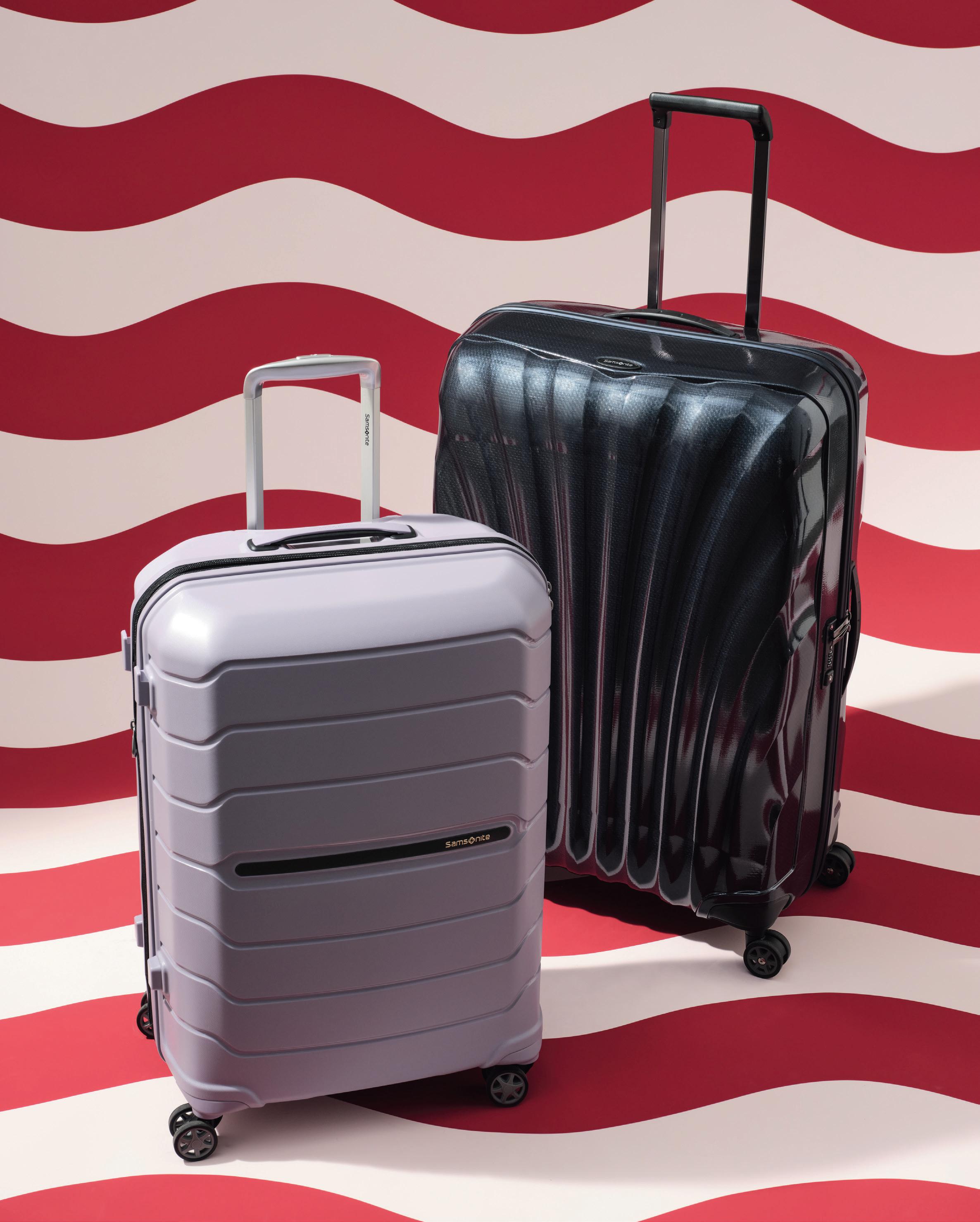 ‘Oc2lite’ Suitcase 75cm in lavender, $465, and ‘C-Lite’ Suitcase 81cm in midnight blue, $1049.